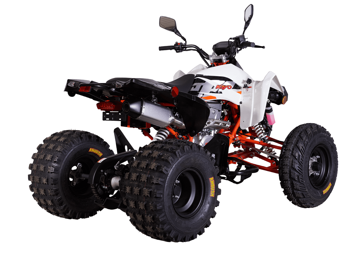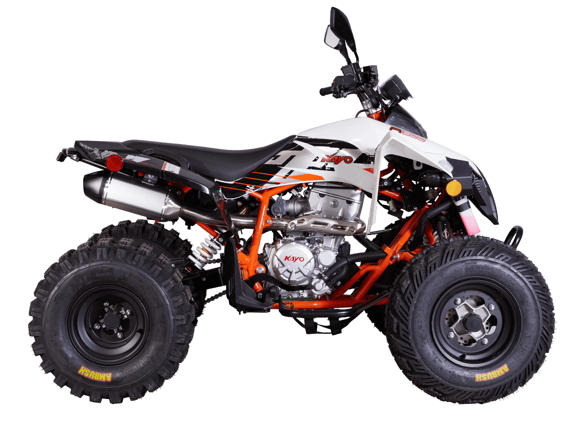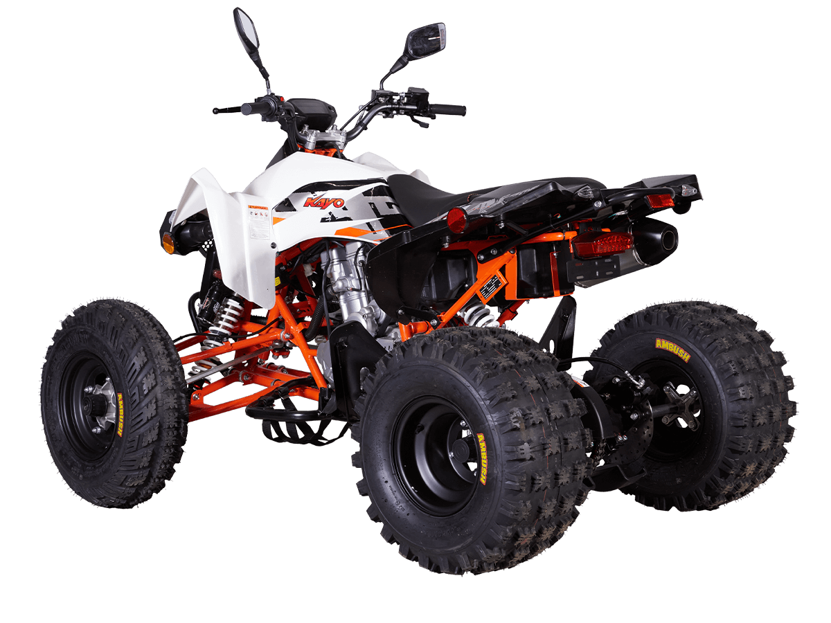 Квадрицикл KAYO A300 – топовый представитель линейки ATV для внедорожного экстрима. Обладает высокими характеристиками, позволяющими справляться с самыми сложными маршрутами. Оснащён ПТС для поездок по дорогам общего пользования. Квадрицикл оснащён одноцилиндровым 4-тактным двигателем LONCIN LX178MN с 4 клапанами и жидкостным охлаждением. Имеет объём 292 см³ и способен развивать мощность до 29 л.с. За подачу топлива отвечает инжектор. Обеспечивает бесперебойную работу в самых жёстких условиях, лёгок в обслуживании и неприхотлив к качеству топлива. Механическая коробка передач с 5 ступенями и реверсом имеет схему R-N-1-2-3-4-5. Объём топливного бака 5,5 литра. На KAYO A300 задействована развитая многорычажная подвеска. Удлинённые рычаги позволили изменить угол наклона амортизаторов и увеличить ширину колеи. Это повысило устойчивость и управляемость квадрицикла. Для адаптации под конкретные задачи подвеску можно настраивать. Длина переднего амортизатора 375 мм, длина заднего амортизатора 380 мм. Рама выполнена из хроммолибденового сплава. Колёса имеют диаметр 10 и 9 дюймов. Обуты во внедорожные покрышки с агрессивным протектором CST Ambush. За торможение отвечает дисковая гидравлическая система. Передние тормозные роторы установлены внутри колёсных дисков, что повысило защиту и надёжность системы в условиях эксплуатации на бездорожье. Квадрицикл оснащён полным комплектом светотехники для поездок в тёмное время суток и по дорогам общего пользования. Габариты квадрицикла 1660х1155х1030 мм, вес 170 кг. Купить квадрицикл KAYO A300 по выгодной цене можно онлайн на нашем сайте или в одном из салонов сети Роллинг Мото.