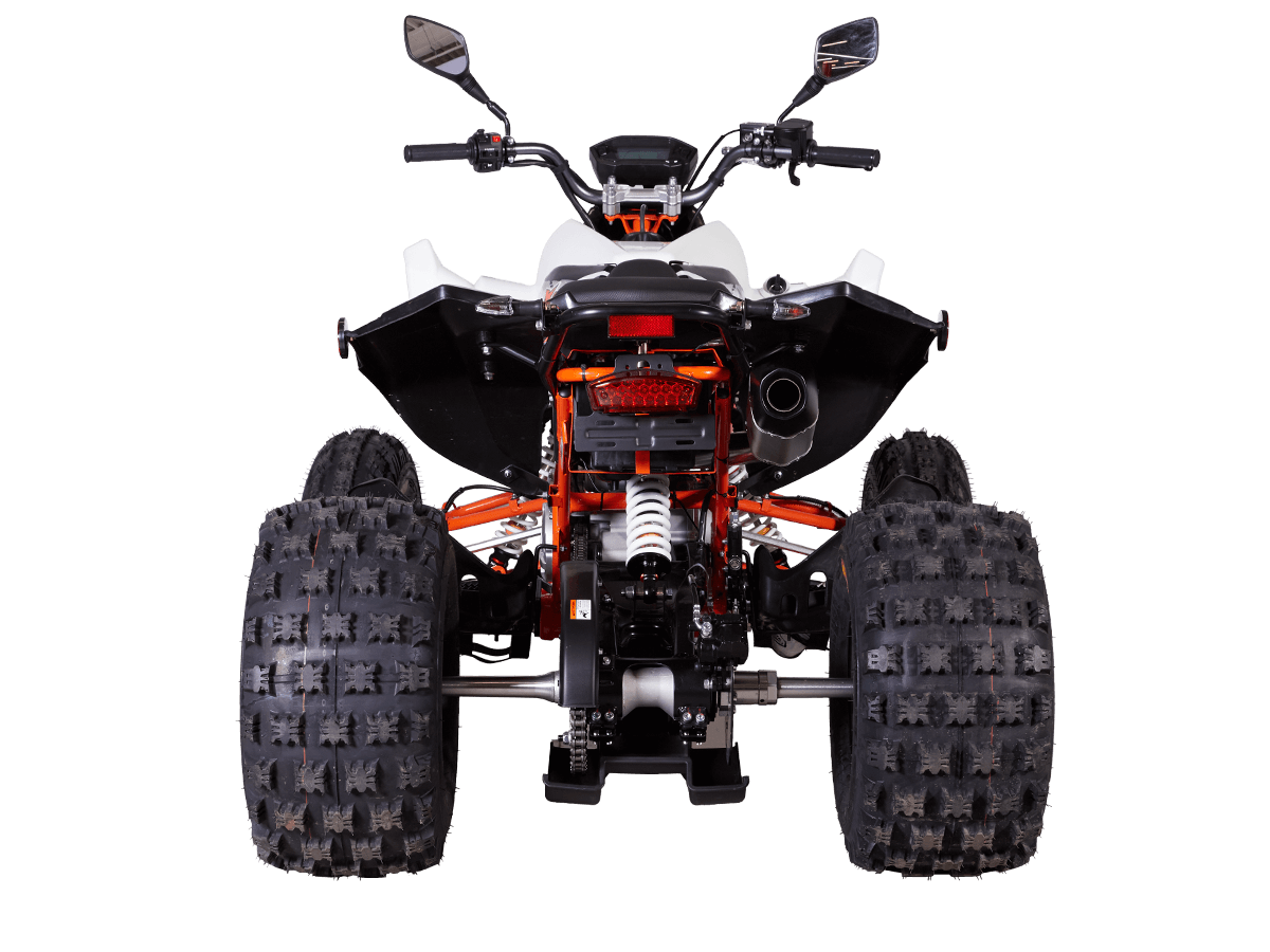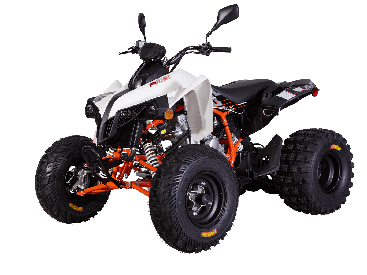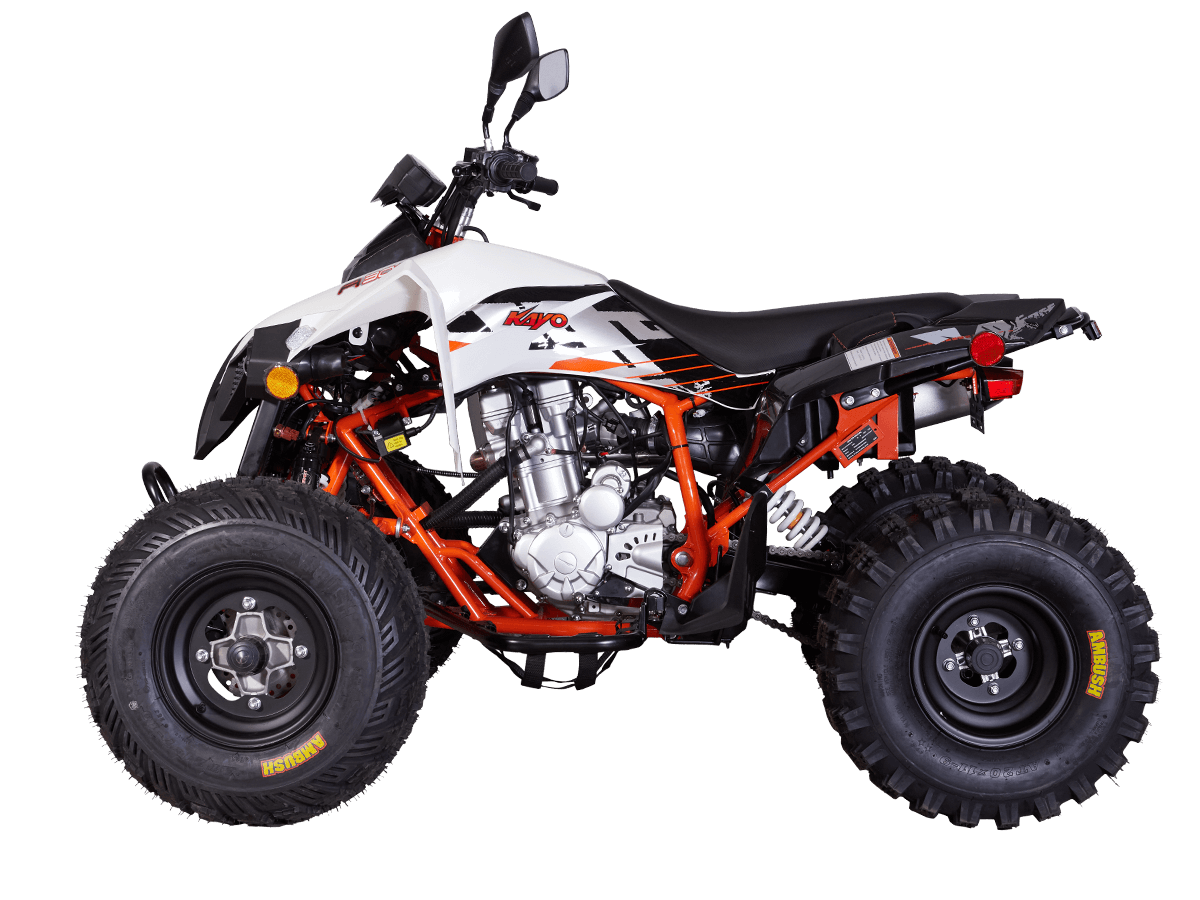 Квадрицикл KAYO A300 – топовый представитель линейки ATV для внедорожного экстрима. Обладает высокими характеристиками, позволяющими справляться с самыми сложными маршрутами. Оснащён ПТС для поездок по дорогам общего пользования. Квадрицикл оснащён одноцилиндровым 4-тактным двигателем LONCIN LX178MN с 4 клапанами и жидкостным охлаждением. Имеет объём 292 см³ и способен развивать мощность до 29 л.с. За подачу топлива отвечает инжектор. Обеспечивает бесперебойную работу в самых жёстких условиях, лёгок в обслуживании и неприхотлив к качеству топлива. Механическая коробка передач с 5 ступенями и реверсом имеет схему R-N-1-2-3-4-5. Объём топливного бака 5,5 литра. На KAYO A300 задействована развитая многорычажная подвеска. Удлинённые рычаги позволили изменить угол наклона амортизаторов и увеличить ширину колеи. Это повысило устойчивость и управляемость квадрицикла. Для адаптации под конкретные задачи подвеску можно настраивать. Длина переднего амортизатора 375 мм, длина заднего амортизатора 380 мм. Рама выполнена из хроммолибденового сплава. Колёса имеют диаметр 10 и 9 дюймов. Обуты во внедорожные покрышки с агрессивным протектором CST Ambush. За торможение отвечает дисковая гидравлическая система. Передние тормозные роторы установлены внутри колёсных дисков, что повысило защиту и надёжность системы в условиях эксплуатации на бездорожье. Квадрицикл оснащён полным комплектом светотехники для поездок в тёмное время суток и по дорогам общего пользования. Габариты квадрицикла 1660х1155х1030 мм, вес 170 кг. Купить квадрицикл KAYO A300 по выгодной цене можно онлайн на нашем сайте или в одном из салонов сети Роллинг Мото.