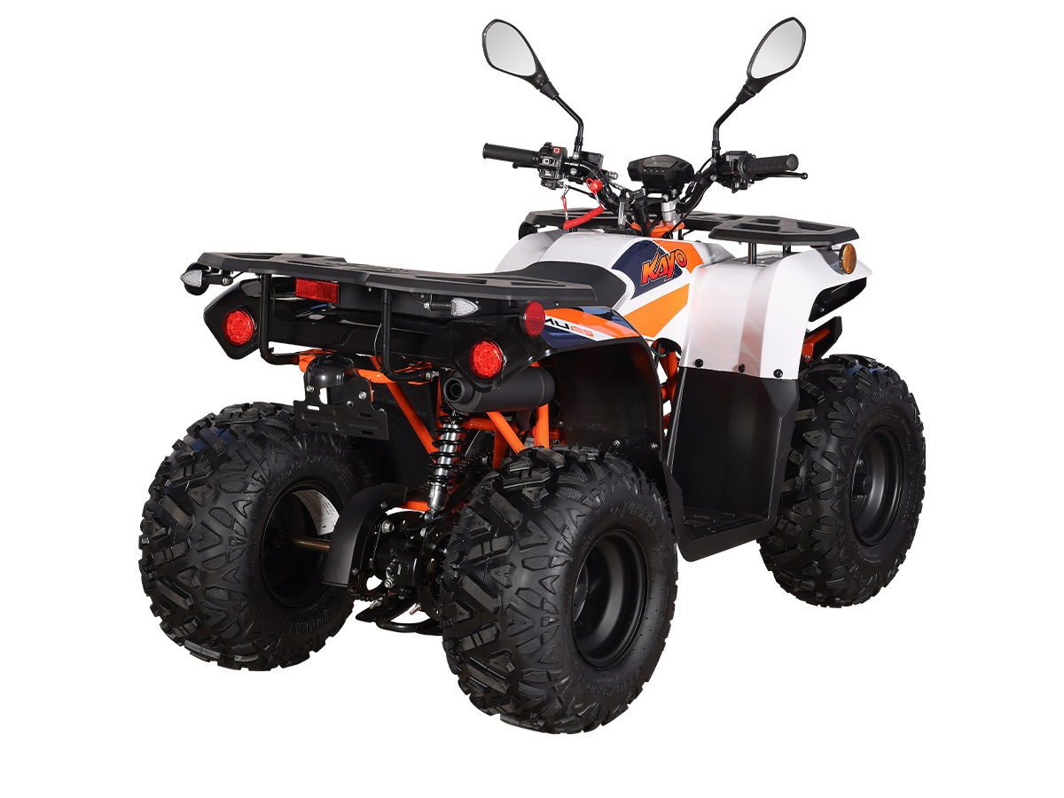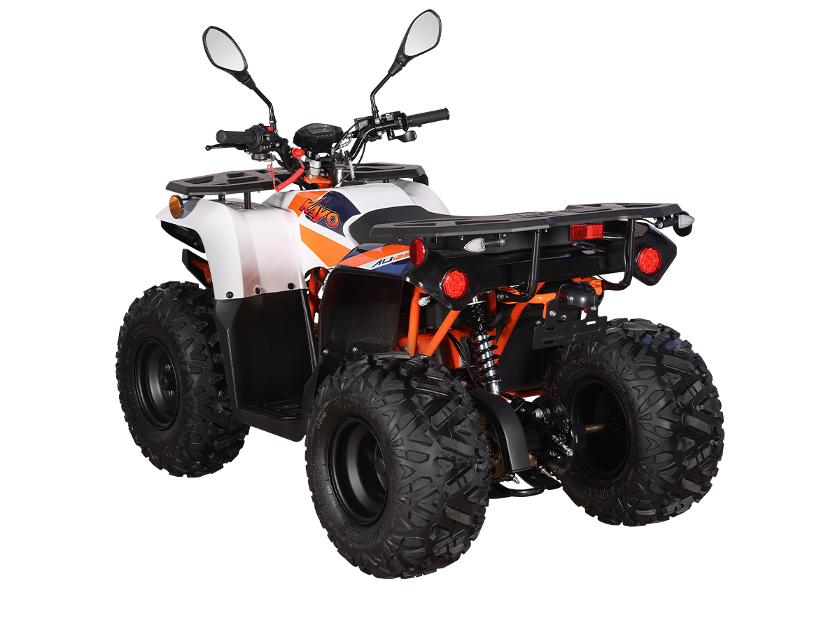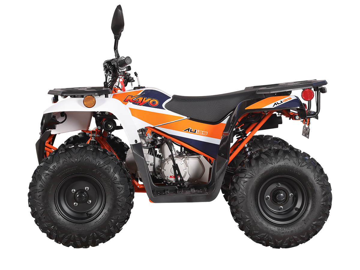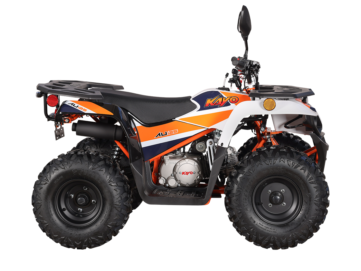 Квадрицикл KAYO AU125 – мощная внедорожная техника для весёлых заездов на природе. Наличие ПТС позволяет ездить по дорогам общего пользования. Габариты и мощность подходят для использования квадроцикла детьми от 11 лет. Оснащён одноцилиндровым 4-тактным двигателем YX154FMI объёмом 120 см³ с воздушным типом охлаждения. Обеспечивает мощность в 7,9 л.с. За подачу топлива отвечает карбюратор JK PZ22WL. Обеспечивает бесперебойную работу в самых жёстких условиях, лёгок в обслуживании и неприхотлив к качеству топлива. Трансмиссия имеет цепную передачу и автоматическую коробку с реверсом и схемой F-N-R. Ёмкость бака 4,5 литра. Диаметр колёс 8 дюймов. Подвеска спереди и сзади представлена амортизаторами длиной 265 мм. За торможение отвечает дисковая гидравлическая система. Квадрицикл оснащён комплектом светотехники для поездок в тёмное время суток и по дорогам общего пользования. Габариты квадроцикла 1430х860х890 мм, вес 98 кг. Купить квадрицикл KAYO AU125 по выгодной цене можно онлайн на нашем сайте или в одном из салонов сети Роллинг Мото.