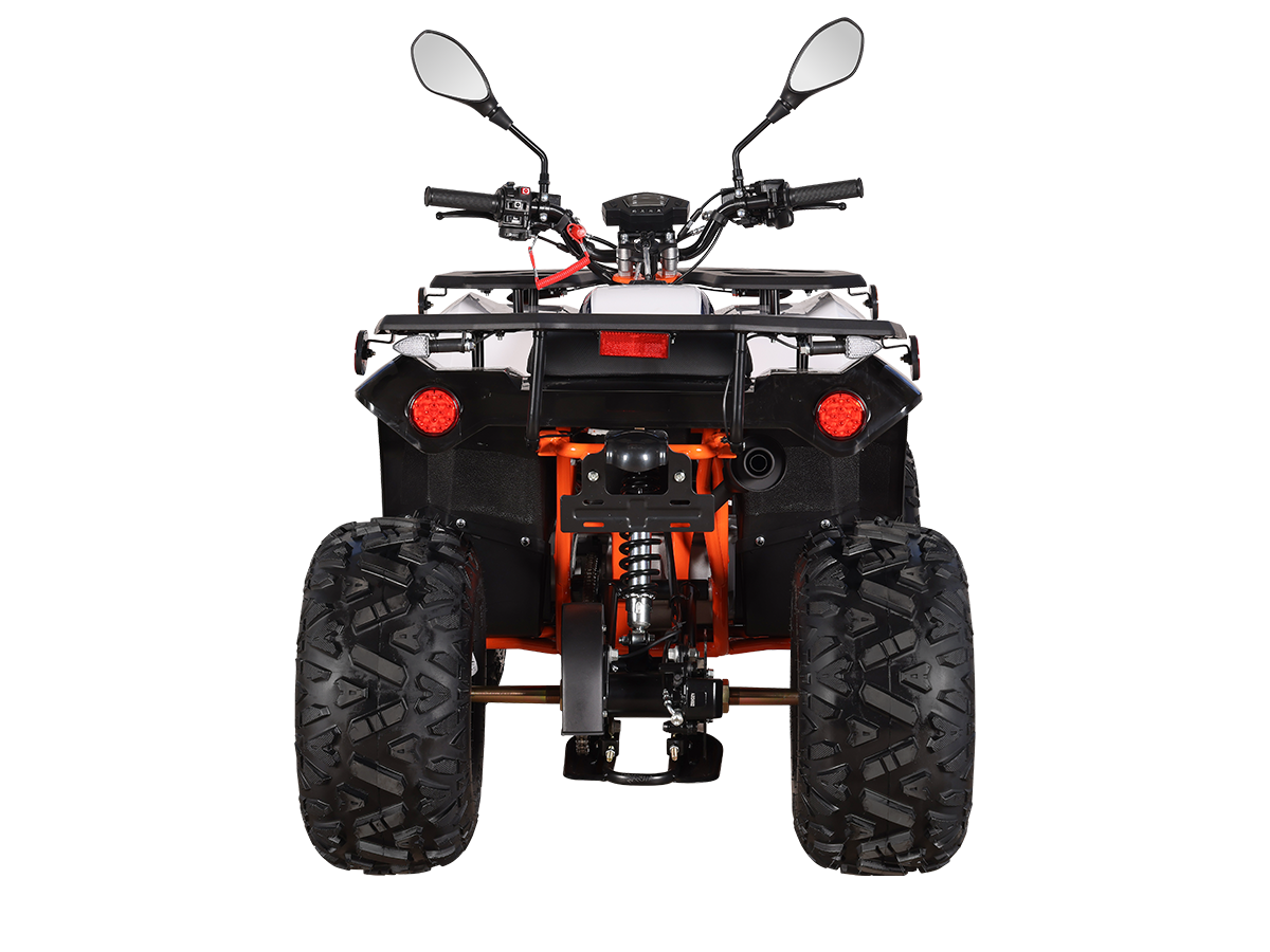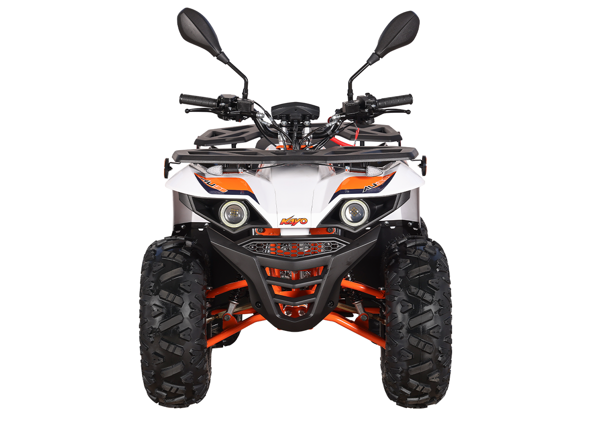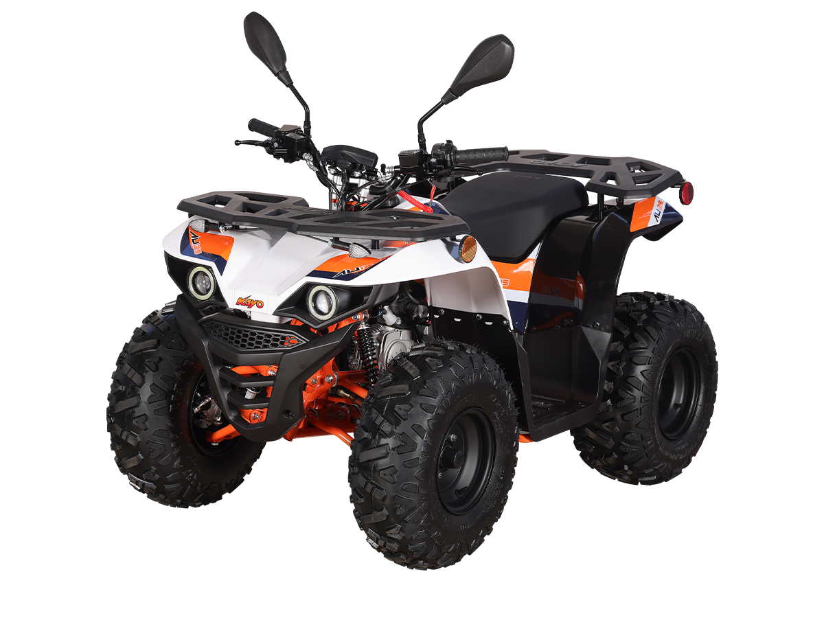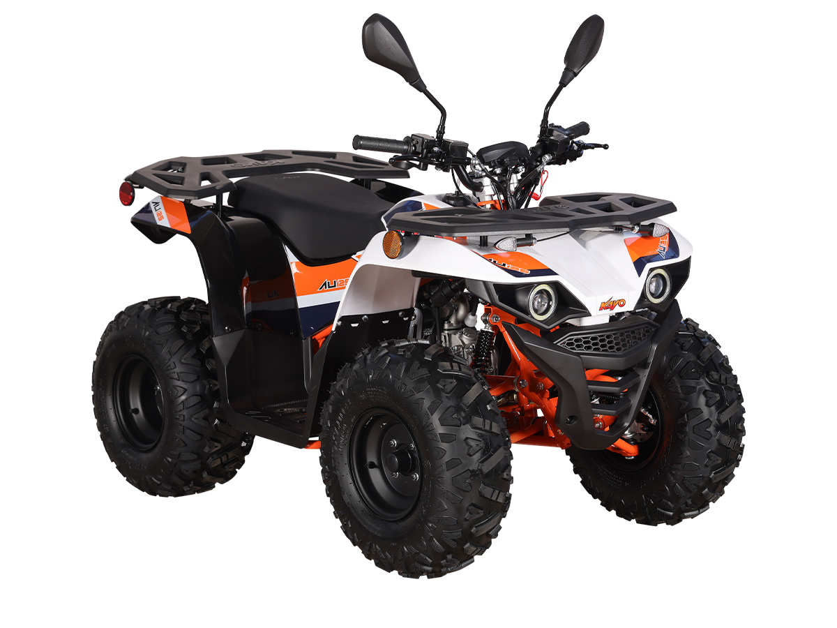 Квадрицикл KAYO AU125 – мощная внедорожная техника для весёлых заездов на природе. Наличие ПТС позволяет ездить по дорогам общего пользования. Габариты и мощность подходят для использования квадроцикла детьми от 11 лет. Оснащён одноцилиндровым 4-тактным двигателем YX154FMI объёмом 120 см³ с воздушным типом охлаждения. Обеспечивает мощность в 7,9 л.с. За подачу топлива отвечает карбюратор JK PZ22WL. Обеспечивает бесперебойную работу в самых жёстких условиях, лёгок в обслуживании и неприхотлив к качеству топлива. Трансмиссия имеет цепную передачу и автоматическую коробку с реверсом и схемой F-N-R. Ёмкость бака 4,5 литра. Диаметр колёс 8 дюймов. Подвеска спереди и сзади представлена амортизаторами длиной 265 мм. За торможение отвечает дисковая гидравлическая система. Квадрицикл оснащён комплектом светотехники для поездок в тёмное время суток и по дорогам общего пользования. Габариты квадроцикла 1430х860х890 мм, вес 98 кг. Купить квадрицикл KAYO AU125 по выгодной цене можно онлайн на нашем сайте или в одном из салонов сети Роллинг Мото.