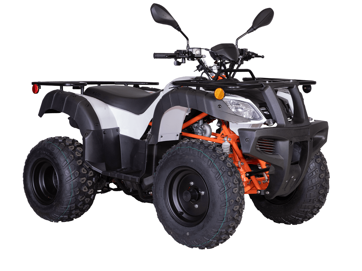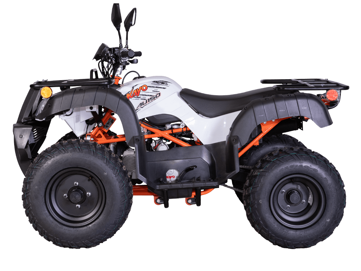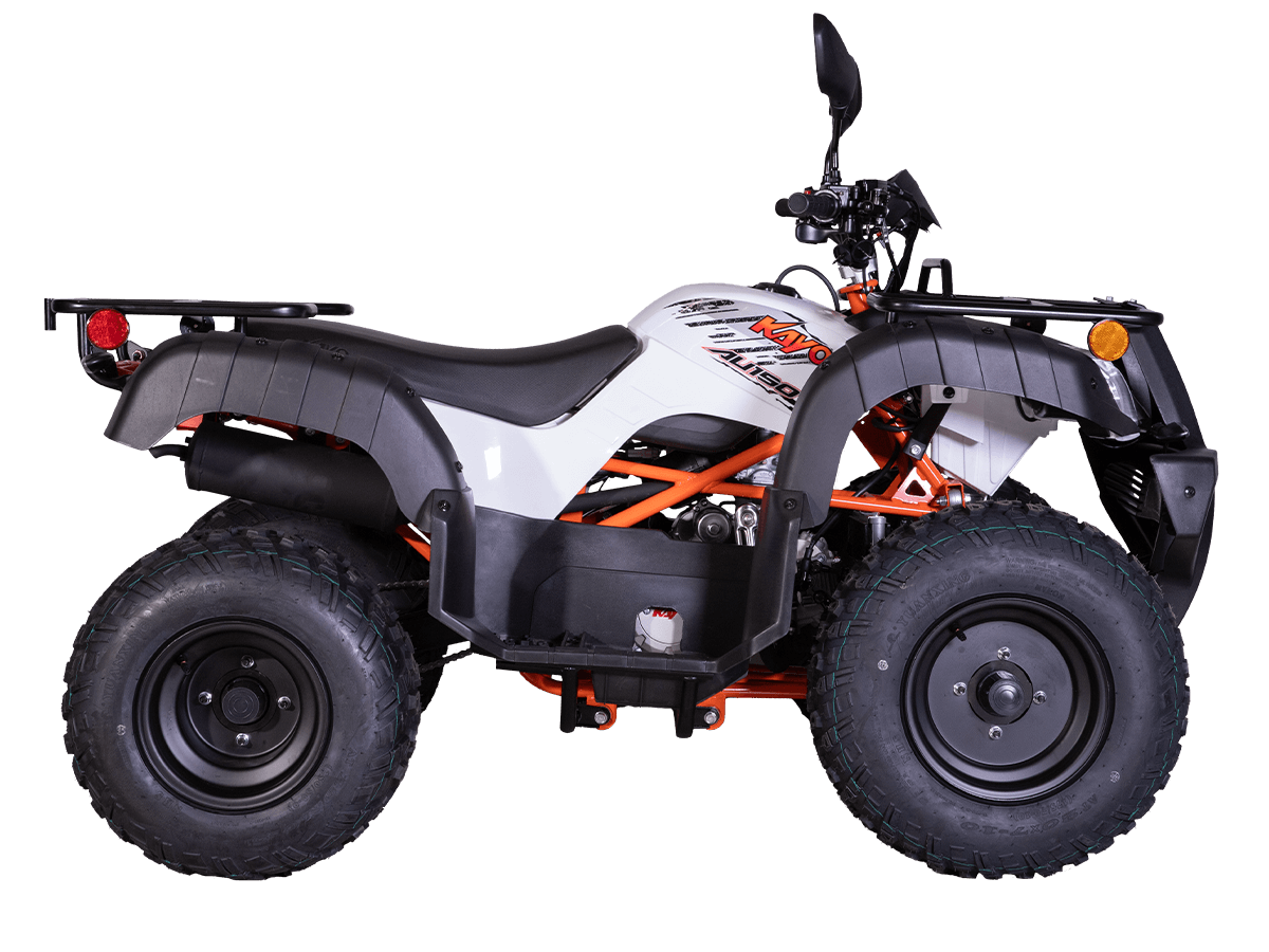 Квадрицикл KAYO AU150 2024 – идеальный вариант для начинающих покорителей бездорожья возрастом от 14 лет. Модель оснащена надёжным 4-тактным одноцилиндровым двигателем YX1P56FMJ-2 воздушного охлаждения объёмом 140 см³ и мощностью 9,2 л.с. Карбюраторная система подачи топлива обеспечивает бесперебойную работу техники, простоту в обслуживании и неприхотливость к качеству топлива. Полуавтоматическая трансмиссия представлена 3-ступенчатой коробкой с реверсом, который облегчает маневрирование в ограниченных пространствах. Привод на ведущие задние колёса осуществляется цепью. Объём топливного бака 5,5 литра. Рама квадрицикла выполнена из лёгкого и прочного хроммолибденового сплава, защищая от повреждений без утяжеления конструкции. На модель установлены литые алюминиевые диски диаметром 10 дюймов, обутые в покрышки с выраженным грунтозацепом. Адаптироваться к неровностям дороги и сохранять мягкое вождение позволяет энергоёмкая длинноходная подвеска. Передние амортизаторы не имеют регулировок, у заднего амортизатора можно настроить преднатяг пружины. Длина передних амортизаторов 270 мм, длина задних амортизаторов 280 мм. Эффективное замедление с любых скоростей гарантируют гидравлические дисковые тормоза спереди и сзади. Комплект качественной оптики, широкие защитные крылья, крепкий багажник для перевозки небольших грузов, эргономичные сиденья и удобное рулевое управление повышают комфорт использования. Благодаря наличию ПТС квадрицикл можно поставить на учёт, чтобы ездить по дорогам общего пользования. Габариты квадрицикла 1663х965х980 мм, вес 141 кг. Колёсная база 1050 мм, высота по седлу 735 мм. Купить квадрицикл KAYO AU150 2024 по выгодной цене можно онлайн на нашем сайте или в одном из салонов сети Роллинг Мото.