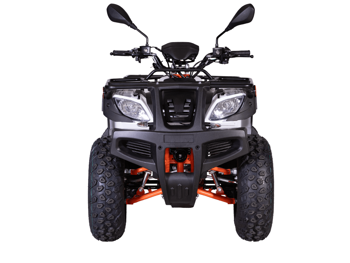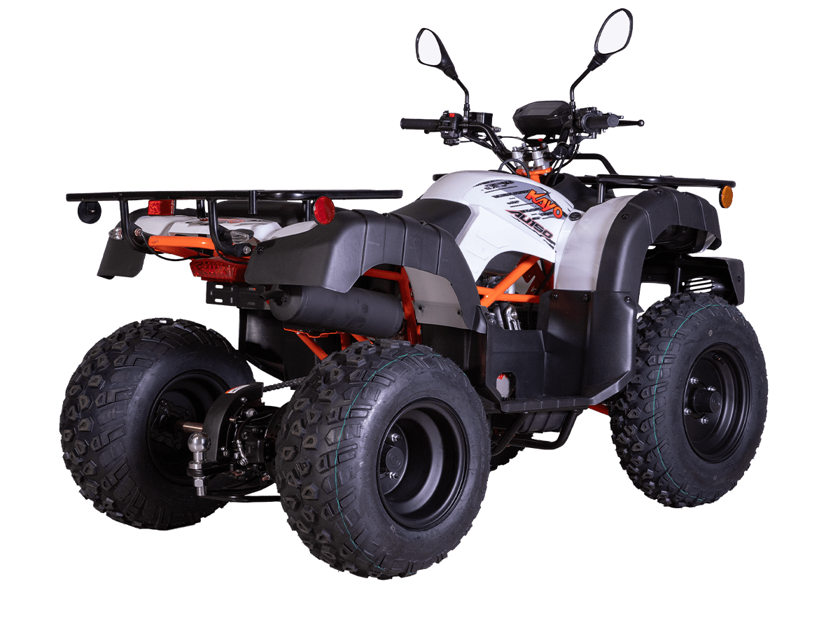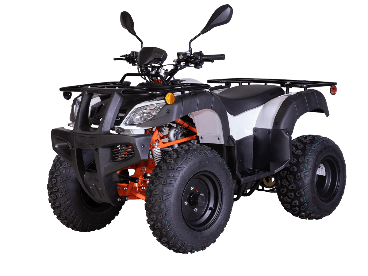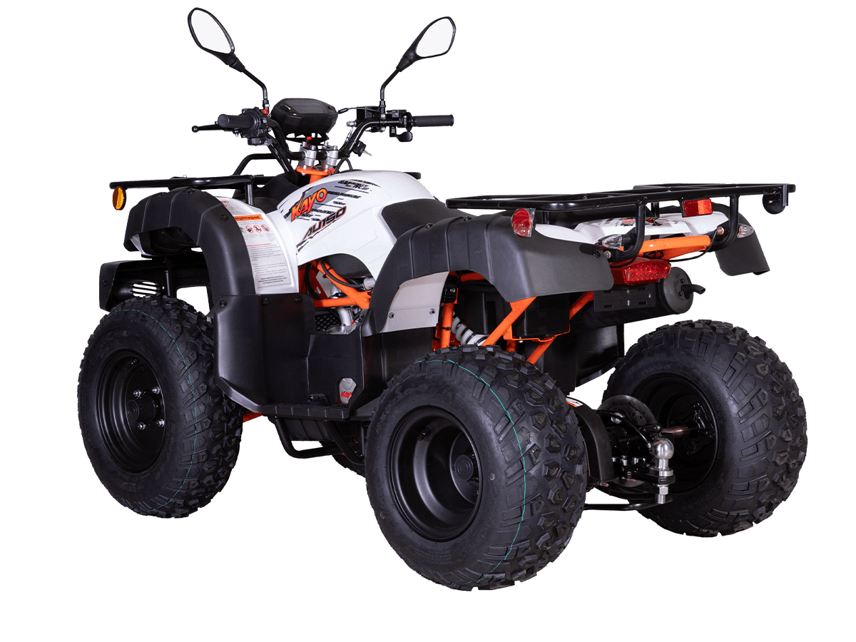Квадрицикл KAYO AU150 2024 – идеальный вариант для начинающих покорителей бездорожья возрастом от 14 лет. Модель оснащена надёжным 4-тактным одноцилиндровым двигателем YX1P56FMJ-2 воздушного охлаждения объёмом 140 см³ и мощностью 9,2 л.с. Карбюраторная система подачи топлива обеспечивает бесперебойную работу техники, простоту в обслуживании и неприхотливость к качеству топлива. Полуавтоматическая трансмиссия представлена 3-ступенчатой коробкой с реверсом, который облегчает маневрирование в ограниченных пространствах. Привод на ведущие задние колёса осуществляется цепью. Объём топливного бака 5,5 литра. Рама квадрицикла выполнена из лёгкого и прочного хроммолибденового сплава, защищая от повреждений без утяжеления конструкции. На модель установлены литые алюминиевые диски диаметром 10 дюймов, обутые в покрышки с выраженным грунтозацепом. Адаптироваться к неровностям дороги и сохранять мягкое вождение позволяет энергоёмкая длинноходная подвеска. Передние амортизаторы не имеют регулировок, у заднего амортизатора можно настроить преднатяг пружины. Длина передних амортизаторов 270 мм, длина задних амортизаторов 280 мм. Эффективное замедление с любых скоростей гарантируют гидравлические дисковые тормоза спереди и сзади. Комплект качественной оптики, широкие защитные крылья, крепкий багажник для перевозки небольших грузов, эргономичные сиденья и удобное рулевое управление повышают комфорт использования. Благодаря наличию ПТС квадрицикл можно поставить на учёт, чтобы ездить по дорогам общего пользования. Габариты квадрицикла 1663х965х980 мм, вес 141 кг. Колёсная база 1050 мм, высота по седлу 735 мм. Купить квадрицикл KAYO AU150 2024 по выгодной цене можно онлайн на нашем сайте или в одном из салонов сети Роллинг Мото.