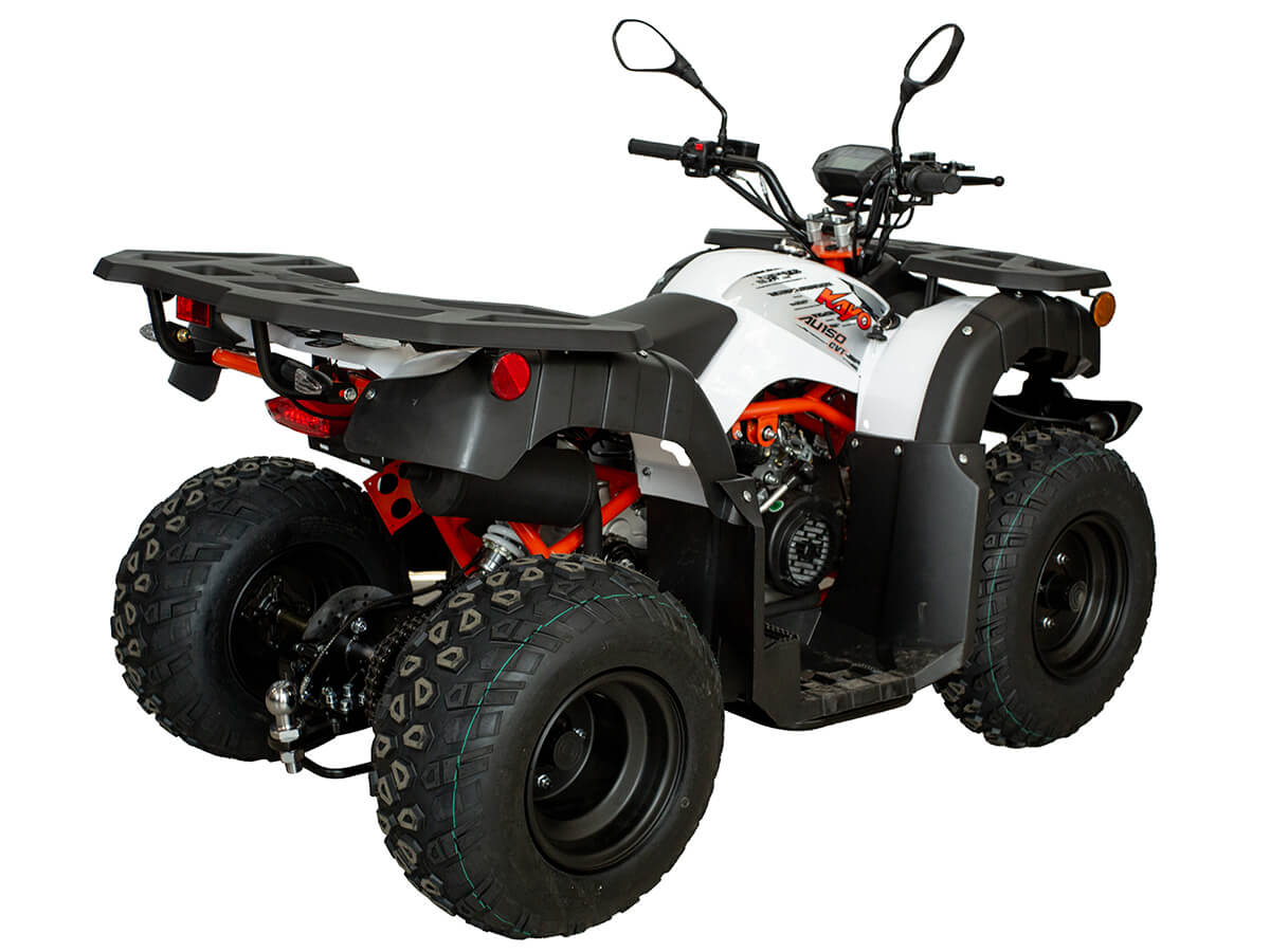 Квадрицикл KAYO AU150 CVT – идеальный вариант для начинающих покорителей бездорожья возрастом от 14 лет. Это сочетание тяговитого двигателя, энергоёмкой подвески, отличной эргономики и агрессивного дизайна. Модель оснащена 4-тактным одноцилиндровым двигателем JN1P57QMJ воздушного охлаждения объёмом 150 см³, который позволяет развивать мощность 8 л.с. Карбюраторная система подачи топлива JK-PD24J-1e сохраняет бесперебойную работу и лёгкость в обслуживании. Объём топливного бака 5,5 литра. Автоматическая трансмиссия вариаторного типа с реверсом облегчает маневрирование в ограниченных пространствах. Привод на ведущие задние колёса осуществляется цепью. Рама квадрицикла выполнена из хромомолибденового сплава, поэтому она лёгкая, прочная и обеспечивает отличную защиту от повреждений. На транспорте установлены литые алюминиевые диски диаметром 10 дюймов, обутые в покрышки с выраженным грунтозацепом. Ходовая часть базируется на передней независимой двухрычажной подвеске с шаровыми опорами и нерегулируемыми амортизаторами. Сзади установлена маятниковая подвеска с регулируемым моноамортизатором. Эффективное замедление гарантируют гидравлические дисковые тормоза спереди и сзади. Комплект качественной оптики, широкие защитные крылья, крепкий багажник для перевозки небольших грузов, эргономичные сиденья и удобное рулевое управление повышает комфорт. Благодаря наличию ПТС технику можно поставить на учёт, чтобы ездить по дорогам общего пользования. Купить квадрицикл KAYO AU150 CVT по выгодной цене можно, оформив онлайн-заказ на нашем сайте.