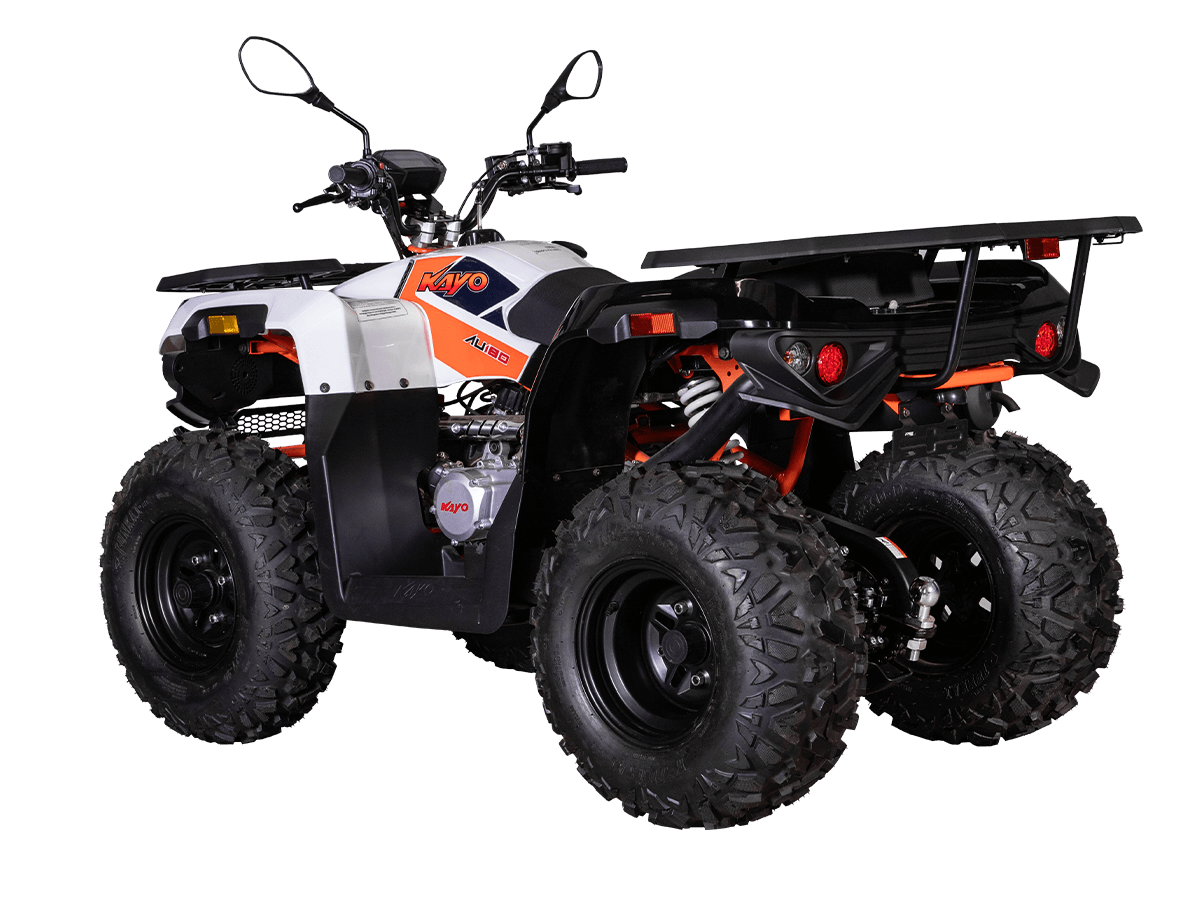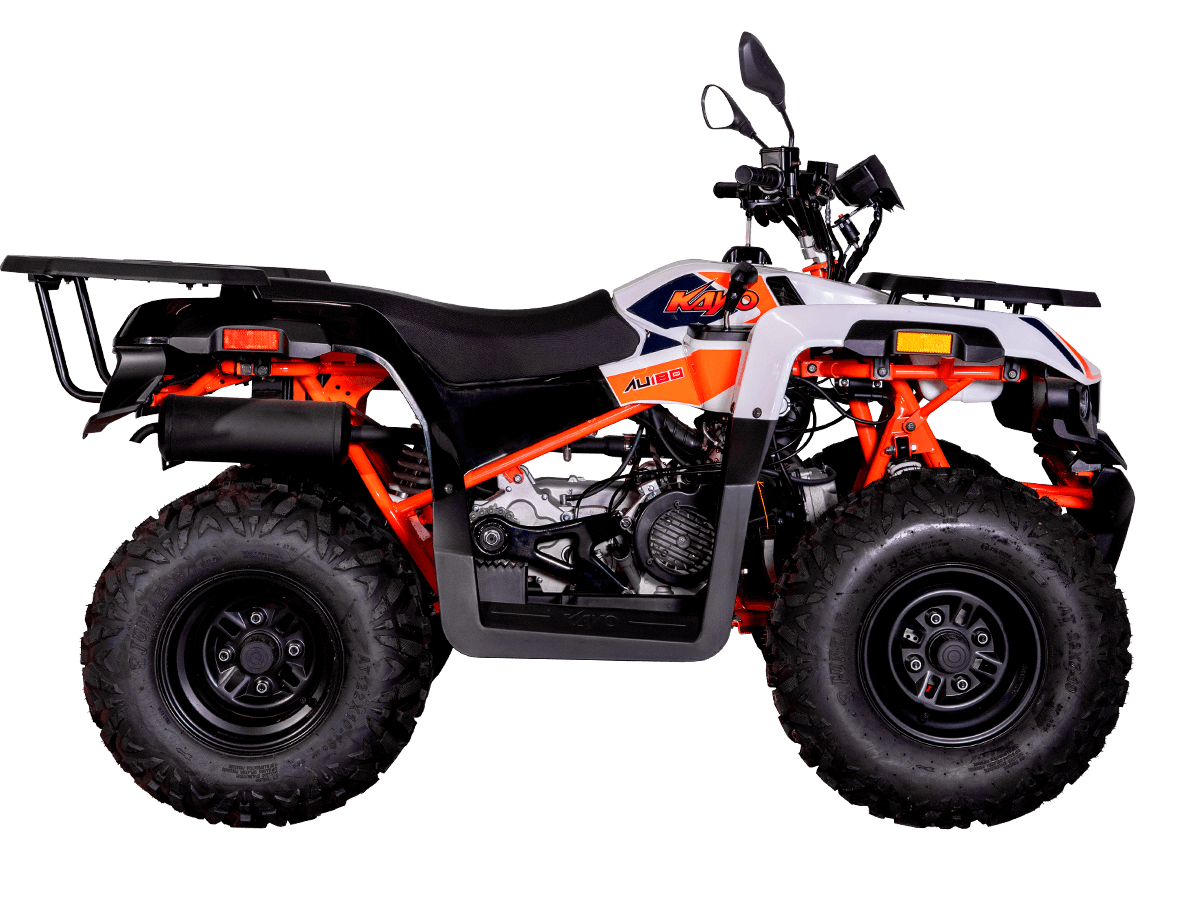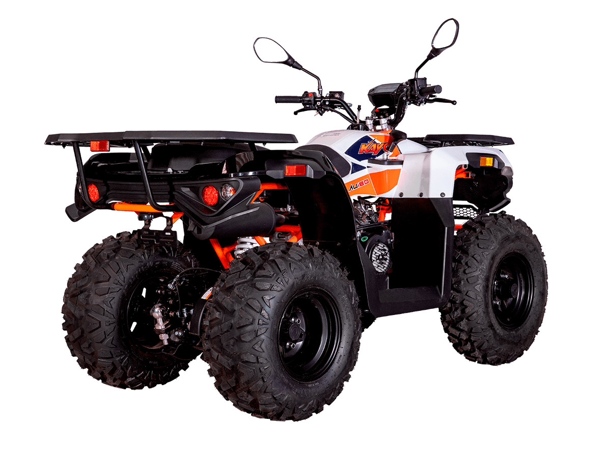 Квадрицикл KAYO AU180 – надёжный и доступный утилитарный квадрицикл с большими возможностями практического применения. Модель пользуется спросом среди поклонников мототехники и любителей бездорожья, поскольку сочетает тяговитый двигатель, энергоёмкую подвеску, отличную эргономику и агрессивный дизайн. Силовая установка представляет собой 4-тактный одноцилиндровый двигатель воздушного охлаждения 1P63QMK объёмом 177 см³, который развивает максимальную мощность 10 л.с. Карбюраторная система подачи топлива сохраняет бесперебойную работу, при этом проста в обслуживании и неприхотлива к качеству топлива. Для исключения масляного голодания в нижней части картера двигателя установлен масляный насос. Это позволят эксплуатировать транспорт под углом до 40˚ без негативных последствий для двигателя. Автоматическая трансмиссия вариаторного типа снабжена реверсом, который облегчает маневрирование в ограниченных пространствах. Привод на ведущие задние колёса осуществляется цепью. Рама квадрицикла из прочного хромомолибденового сплава защищает от повреждений без утяжеления конструкции. Литые алюминиевые диски диаметром 10 дюймов обуты в покрышки с выраженным грунтозацепом. Ходовая часть базируется на передней независимой двухрычажной подвеске с шаровыми опорами и нерегулируемыми амортизаторами. Сзади установлена маятниковая подвеска с регулируемым моноамортизатором. Эффективное замедление с любых скоростей обеспечивают гидравлические дисковые тормоза спереди и сзади. Модель обладает комплектом качественной оптики, широкими защитными крыльями, передней и задней багажными площадками для перевозки небольших грузов, фаркопом для прицепа, а также эргономичным сиденьем и удобным рулевым управлением. Благодаря наличию ПТС технику можно поставить на учёт и ездить по дорогам общего пользования. Купить квадрицикл KAYO AU180 по выгодной цене можно, оформив онлайн-заказ на нашем сайте.