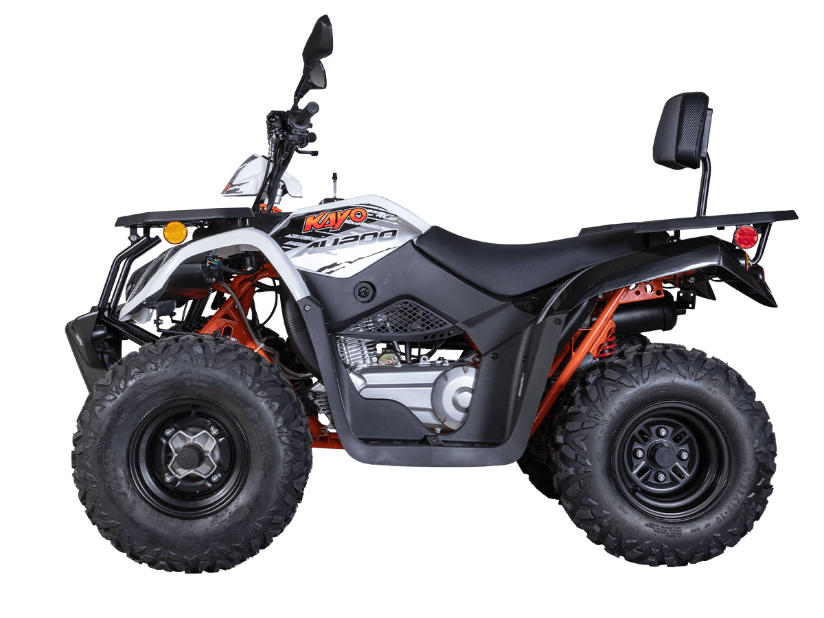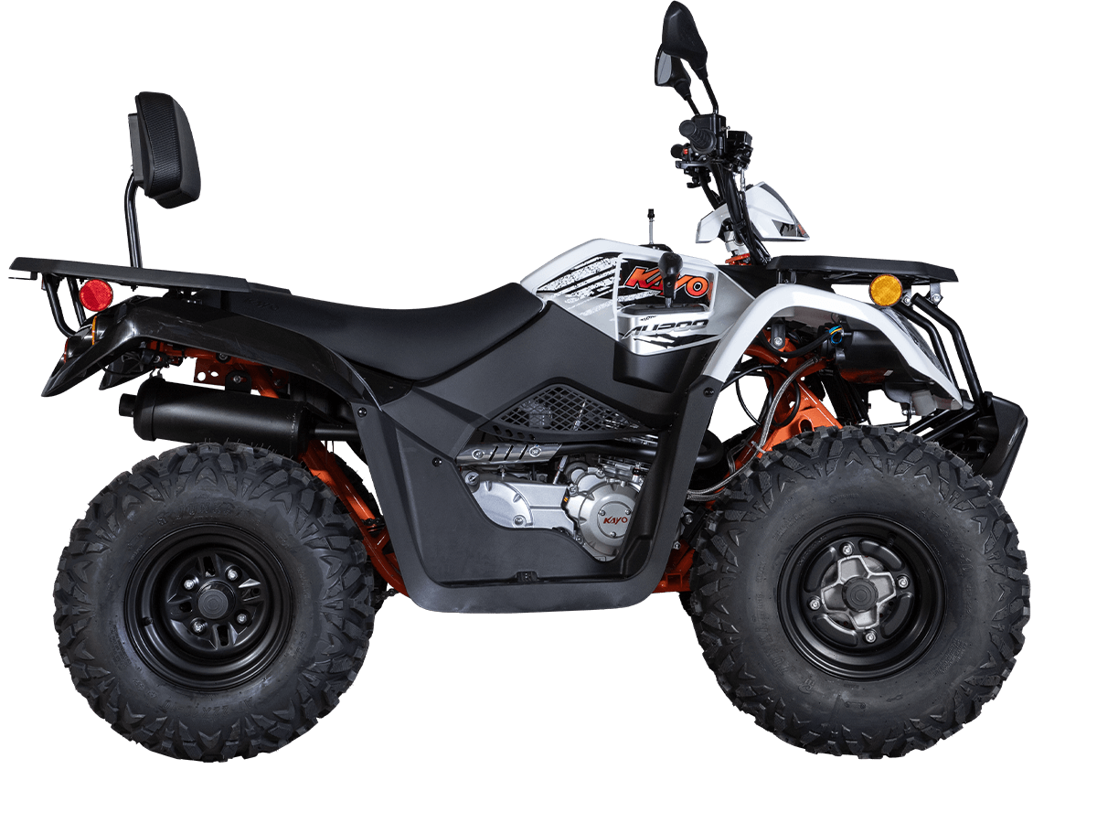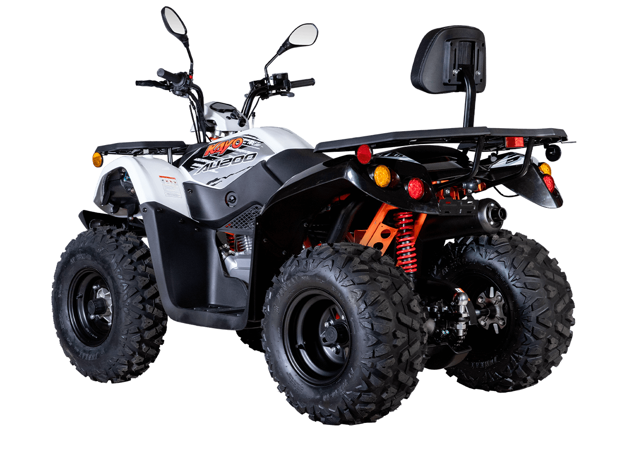 Квадрицикл KAYO AU200 2024 – популярная и доступная модель для любителей внедорожных приключений и активного отдыха. Подходит для райдеров разного возраста, роста и с разным опытом. Квадрицикл оснащён одноцилиндровым 4-тактным двигателем LONCIN LX163FML с вертикальным расположением цилиндра и воздушным охлаждением. Двигатель имеет объём 196 см³ и выдаёт 14 л.с. Наличие балансирного вала позволяет снизить интенсивность вибраций и повышает комфорт во время поездок. За подачу топлива отвечает карбюратор PZ30. Объём топливного бака 9 литров. Для трансмиссии используется вариаторная коробка передач со схемой R-N-F. На крышке вариатора установлен шноркель с высокорасположенным воздухозаборным отверстием. Это позволяет пересекать небольшие водные преграды, не боясь попадания воды в трансмиссию. На квадрицикл установлены колёса диаметром 10 дюймов. Для передней подвески используется амортизатор длиной 260 мм, а сзади – амортизатор длиной 310 мм с регулировками. Для торможения используются гидравлические дисковые тормоза, установленные спереди и сзади. Габариты 1780х955х1050 мм, вес 180 кг. Колёсная база 1120 мм, высота по седлу 760 мм. Все кнопки управления собраны в один компактный пульт: кнопки запуска и остановки двигателя, переключатели светового оборудования, звуковой сигнал, рычаг подсоса. Квадрицикл оснащён передним и задним багажниками из стали с пластиковой облицовкой. Купить квадрицикл KAYO AU200 2024 по выгодной цене можно онлайн на нашем сайте или в одном из салонов сети Роллинг Мото.