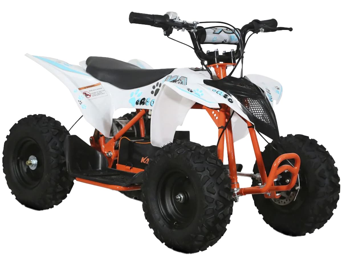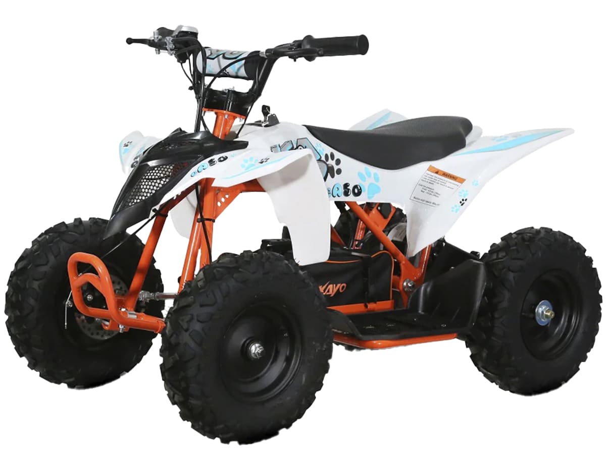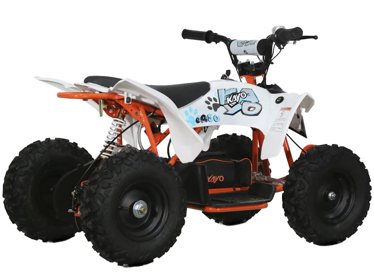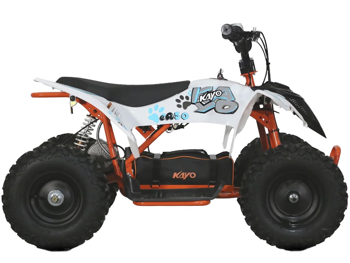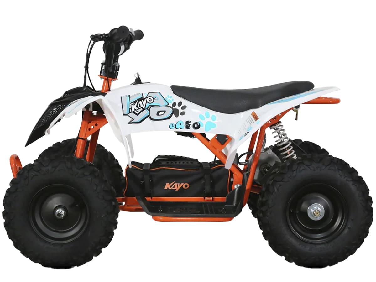 Квадроцикл KAYO EA50 – детская модель с электрическим двигателем для весёлых и безопасных заездов на природе. Оснащён электрическим бесщёточным двигателем мощностью 800W. Обеспечивает плавную и бесшумную езду без выхлопных газов. Свинцово-кислотный аккумулятор 36V 12AH держит запас хода в 90 минут езды. Полная зарядка аккумулятора занимает около 8 часов. Трансмиссия представлена 2-ступенчатой коробкой с реверсом. Диаметр колёс 6 дюймов. Амортизация спереди отсутствует. Сзади установлен моноамортизатор длиной 200 мм. Спереди и сзади есть механические дисковые тормоза. Приборная панель представлена электронным дисплеем, куда выводится информация о скорости, заряде и километраже. Габариты квадроцикла 1030х580х660 мм. Внимание: поставляется в разобранном виде. Предназначен для самостоятельной сборки. Купить KAYO EA50 по выгодной цене можно онлайн на нашем сайте или в одном из салонов сети Роллинг Мото.