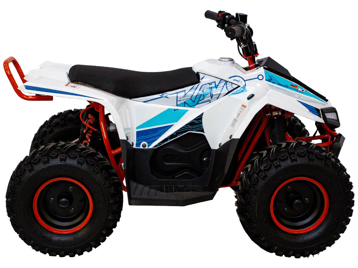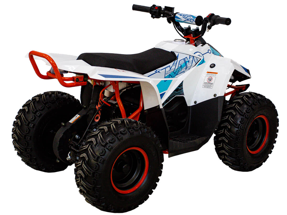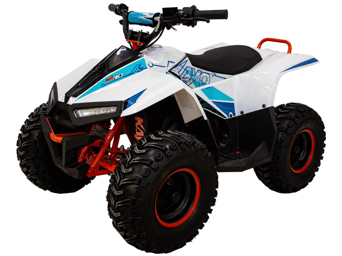 Квадроцикл KAYO eA70 2024 – послушный и лёгкий в управлении электро ATV, созданный для освоения основ. Это мощная внедорожная техника для весёлых и безопасных заездов, которая подходит для детей от 4 до 8 лет – лучший старт для юного гонщика! Квадроцикл оснащён щёточным электродвигателем мощностью 1400W. Обеспечивает плавную и бесшумную езду без выхлопных газов. Свинцово-кислотный аккумулятор 48V 20A обеспечивает запас хода 50 км. Полная зарядка аккумулятора занимает около 8 часов. Трансмиссия представлена 3-ступенчатой коробкой с реверсом. Квадроцикл имеет систему плавного ускорения и торможения, что обеспечивает комфорт и безопасность во время заездов. Имеется регулируемый ограничитель максимальной скорости. Грузоподъёмность квадроцикла 50 кг. Диаметр колёс 7 дюймов. Подвеска спереди представлена нерегулируемым амортизатором длиной 250 мм, а сзади – регулируемым амортизатором длиной 235 мм. Сзади установлен гидравлический дисковый тормоз. Приборная панель представлена электронным дисплеем, куда выводится информация о скорости, заряде аккумулятора и километраже. Габариты квадроцикла 1250х780х820 мм, вес 93 кг. Колёсная база 790 мм, высота по седлу 600 мм. Купить квадроцикл KAYO eA70 2024 по выгодной цене можно онлайн на нашем сайте или в одном из салонов сети Роллинг Мото.