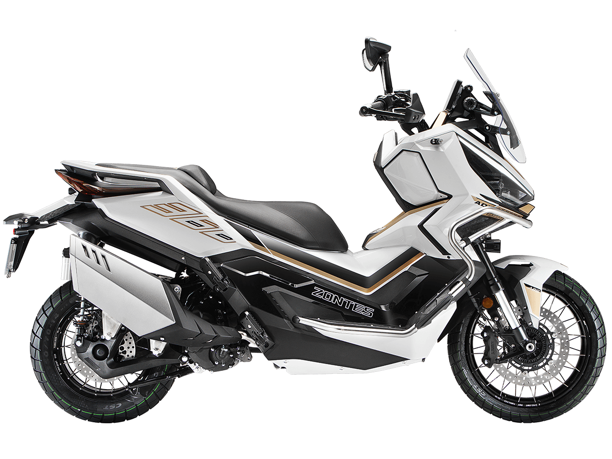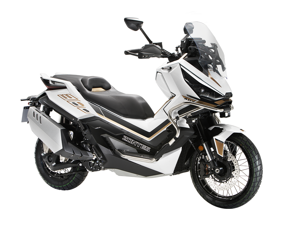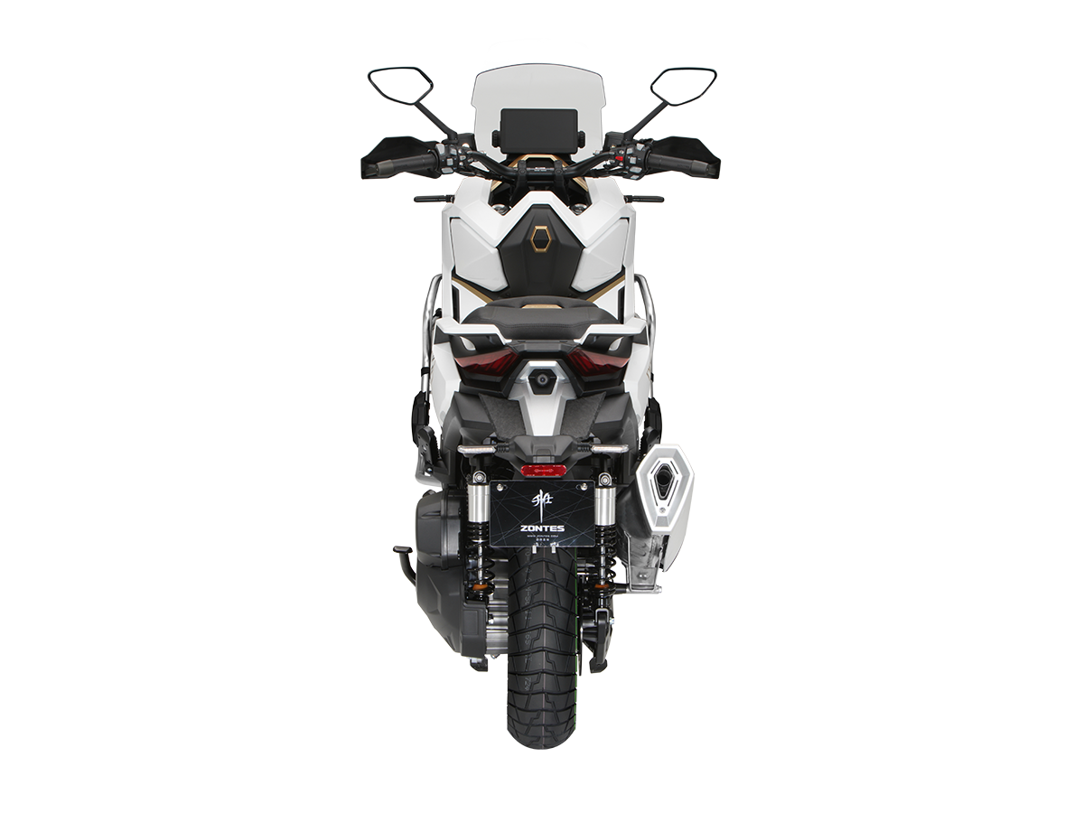 Скутер ZONTES ZT368-G – максискутер двойного назначения, готовый пронестись по улицам города за его пределы и отправиться по грунтовым тропам прокладывать свой маршрут туда, куда вам потребуется. Регулируемая подвеска с перевёрнутой телескопической вилкой спереди обеспечит отличную управляемость и устойчивость в любых условиях. Силовая установка представлена одноцилиндровым 4-тактным двигателем. Двигатель имеет объём 368 см³ и обеспечивает мощность в 38,8 л.с. Оснащён инжектором BOSCH, системой жидкостного охлаждения и вариатором. Запуск двигателя осуществляется с помощью бесключевого доступа. Ёмкость топливного бака 17,5 литра. Колёса имеют диаметр 17 дюймов спереди и 14 дюймов сзади. Для подвески спереди используется телескопическая вилка перевёрнутого типа, а сзади установлены 2 гидравлических амортизатора. Гидравлические дисковые тормоза произведены компанией J.JUAN, входящей в холдинг BREMBO. Мотоцикл также оснащён 2-канальной ABS-системой, противобуксовочной системой TCS System и датчиками давления в шинах. ZT350-G оборудован яркой LED-фарой, мультимедийной приборной панелью с TFT-дисплеем, имеются 2 USB-порта. Габариты скутера 2230х925х1290 мм. Колёсная база 1560 мм. Высота по седлу 795 мм. Вес 198 кг. Комплектация и внешний вид мотоцикла могут отличаться в зависимости от поставки. Изображение на сайте не гарантирует наличие тех или иных опций. Уточняйте информацию при оформлении заказа. Купить скутер ZONTES ZT368-G по выгодной цене можно онлайн на нашем сайте или в одном из салонов сети Роллинг Мото.