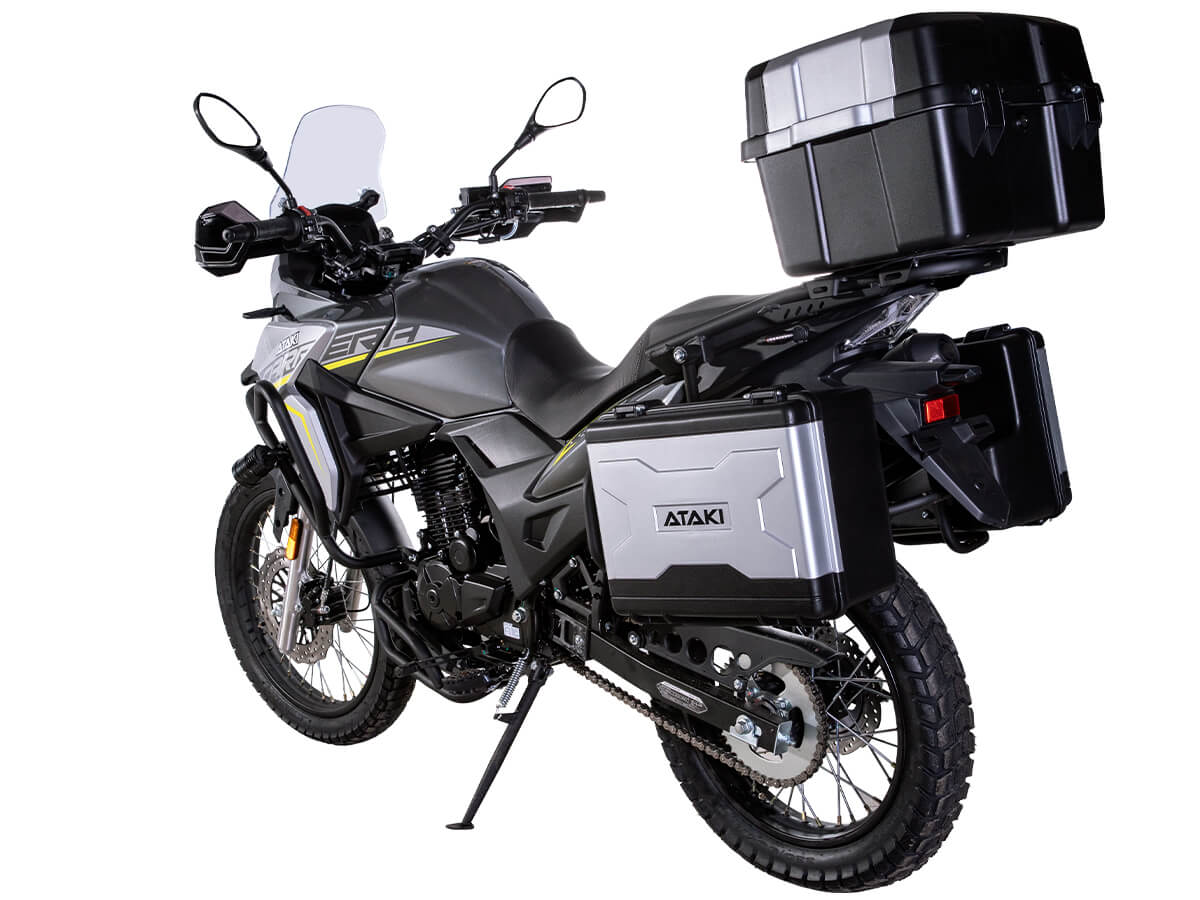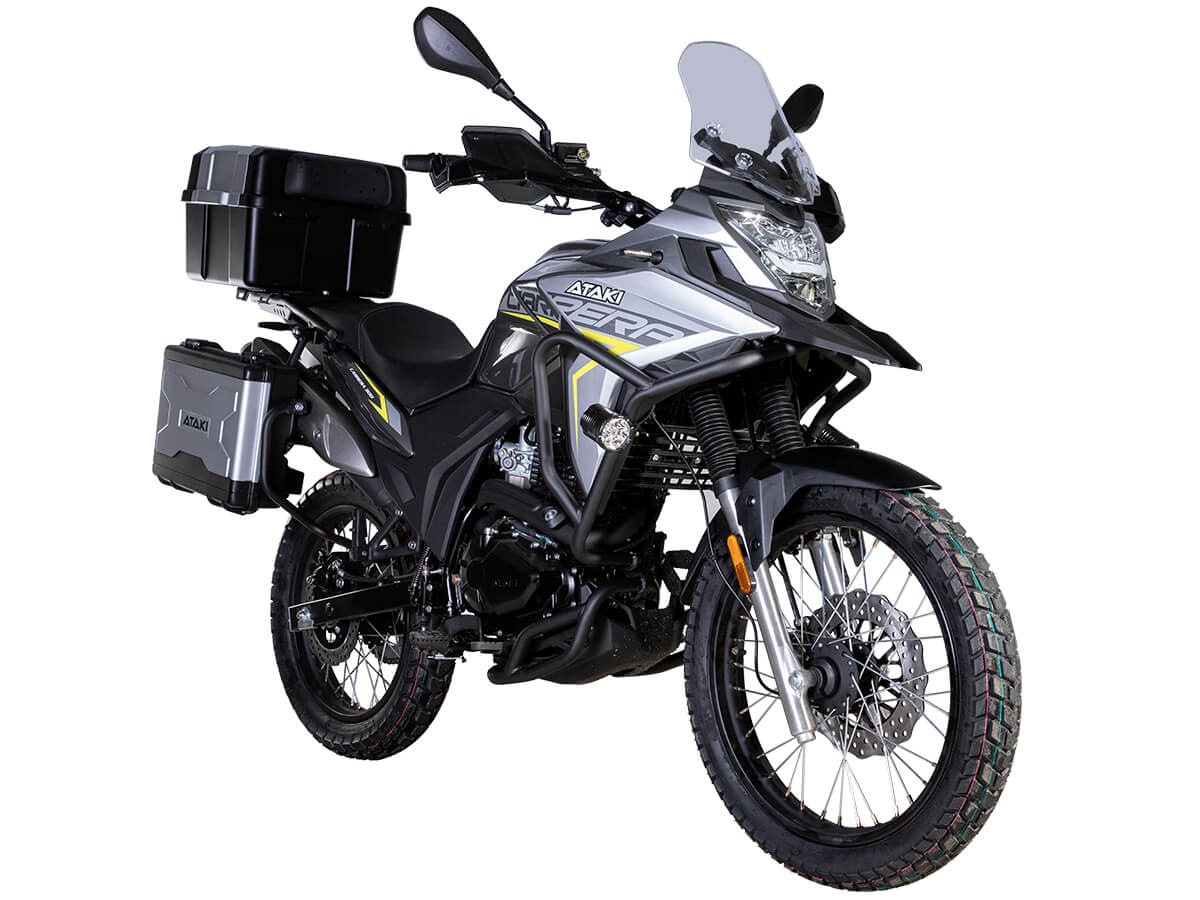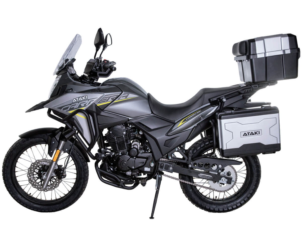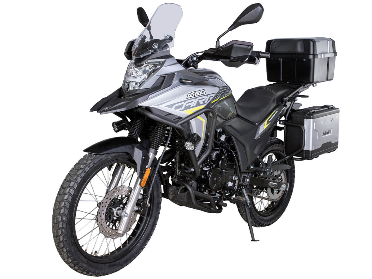 Мотоцикл ATAKI Carrera 300 – турэндуро, готовый к покорению любых маршрутов. Идеально подходит для поездок, когда не знаешь, чего ожидать от дороги. Уже в базовой комплектации имеются: • Багажные кофры; • Защитные дуги; • Дополнительный свет; • USB-разъём для подключения и зарядки. Одноцилиндровый 4-тактный двигатель ZONGSHEN PR300/ZS175FMM-5 имеет объём 271 см³ и выдаёт мощность в 24 л.с. Для поддержания оптимальной температуры двигателя используется воздушное охлаждение. За подачу топлива отвечает карбюратор PZ30. Он обеспечивает бесперебойную работу в самых жёстких условиях, прост в обслуживании и неприхотлив к качеству топлива. Коробка передач с 6 ступенями имеет классическую схему 1-N-2-3-4-5-6. Объём топливного бака 16 литров. Запуск двигателя осуществляется с помощью электростартера. На мотоцикл установлены спицованные колёса диаметром 19 дюймов спереди и 17 дюймов сзади. Передняя подвеска представлена телескопической вилкой с ходом 131 мм, а сзади используется моноамортизатор с ходом 39 мм. В паре они позволяют эффективно амортизировать удары и поглощать избыточные вибрации при езде по бездорожью. За торможение отвечает дисковая гидравлическая система. Габариты 2065x915x1165 мм. Колёсная база 1300 мм. Высота по седлу 820 мм. Вес 165 кг. Мотоцикл имеет ПТС и все необходимое для езды по дорогам общего пользования. Для освещения используется яркая LED-оптика. На дугах установлен дополнительный свет, повышающий площадь освещения дороги и улучшающий видимость. Комплектация и внешний вид мотоцикла могут отличаться в зависимости от поставки. Изображение на сайте не гарантирует наличие тех или иных опций. Уточняйте информацию при оформлении заказа. Купить мотоцикл ATAKI Carrera 300 по привлекательной цене можно онлайн на нашем сайте или в одном из салонов сети Роллинг Мото.