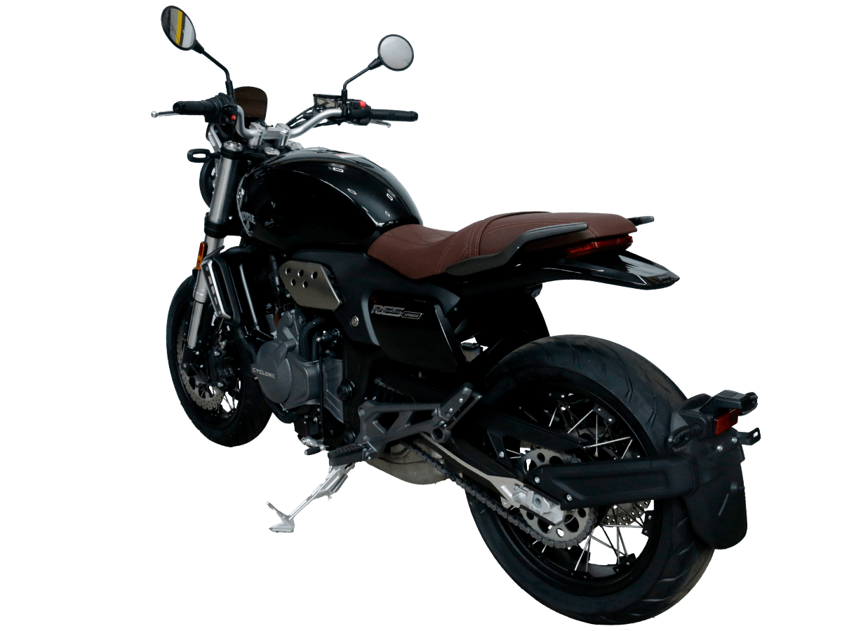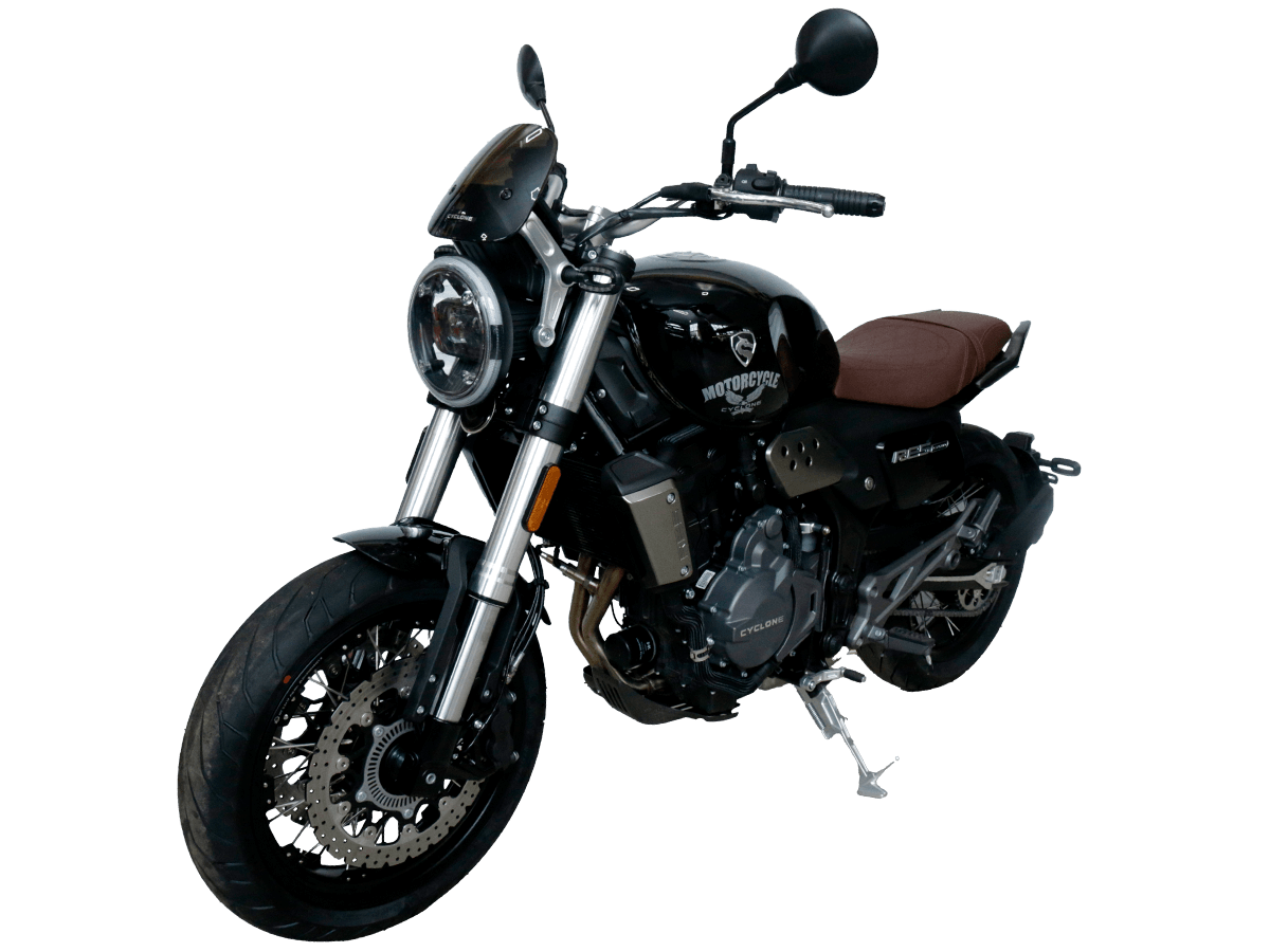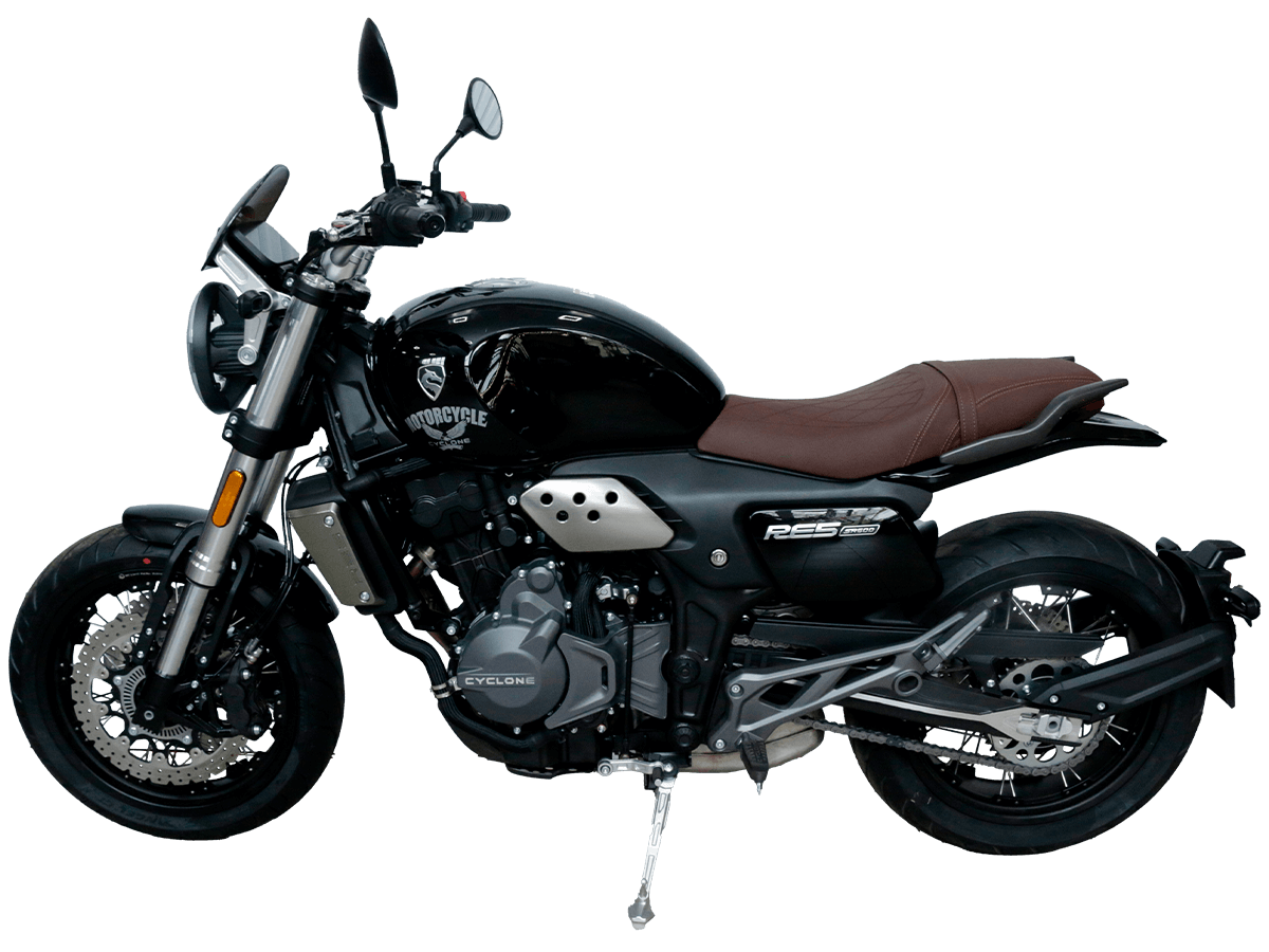 CYCLONE RE5 (SR600) – классик, в котором брутальная простота объединяется с современными технологиями. Данная модель является самой крупнокубатурной среди классических мотоциклов компании CYCLONE. Двухцилиндровый четырёхтактный двигатель объёмом 550 см 3 выдаёт 60 л.с. на 8500 об/мин. Максимальный крутящий момент достигается на 6500 об/мин и составляет 55 Н·м. Инжекторный впрыск топлива с блоком управления BOSCH увеличивает топливную экономичность, а также позволяет добиться высокой приёмистости и неприхотливости агрегата. Жидкостная система охлаждения не допустит перегрева двигателя даже при самом агрессивном вождении. На мотоцикл установлена 6-ступенчатая механическая коробка передач. Максимальная скорость мотоцикла составляет 170 км/ч. RE5 оснащён классическими спицевыми колёсами диаметром 17 дюймов. Колёса обуты в бескамерные покрышки от легендарной фирмы PIRELLI. С неровностями дороги эффективно справляются телескопическая вилка перевёрнутого типа спереди и маятник с моноамортизатором сзади. Ход передней подвески составляет 120 мм, задней – 50 мм. Оба компонента подвески являются регулируемыми. Эффективное и безопасное замедление с любых скоростей обеспечивают гидравлические дисковые тормоза с ABS спереди и сзади. Тормозные системы произведены известной испанской фирмой J.JUAN (входящей в легендарный холдинг BREMBO). Клиренс мотоцикла составляет 155 мм. Объём топливного бака – 20 л. Снаряжённая масса – 204 кг. Из дополнительного оборудования можно выделить USB-порт и датчики давления в шинах. Мотоцикл сочетает в себе отличные технические характеристики, комфорт и надёжность, что позволяет вам ощутить настоящую свободу на любой дороге. Комплектация и внешний вид мотоцикла могут отличаться в зависимости от поставки. Изображение на сайте не гарантирует наличие тех или иных опций. Уточняйте информацию при оформлении заказа. Купить мотоцикл CYCLONE RE5 (SR600) по выгодной цене можно, оформив онлайн-заказ на нашем сайте.