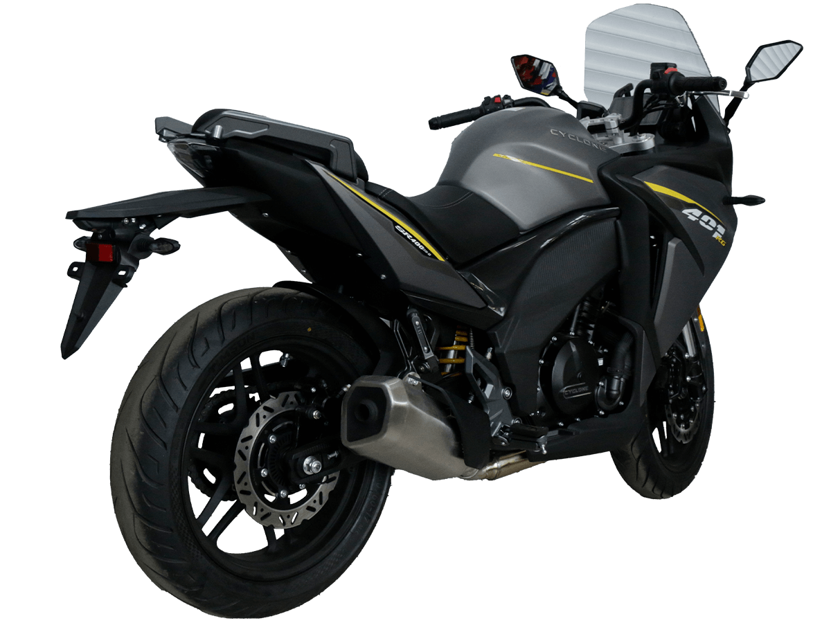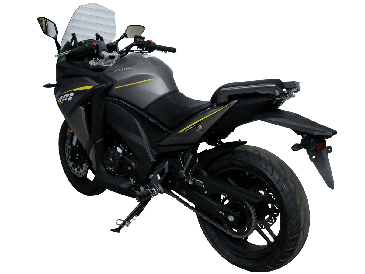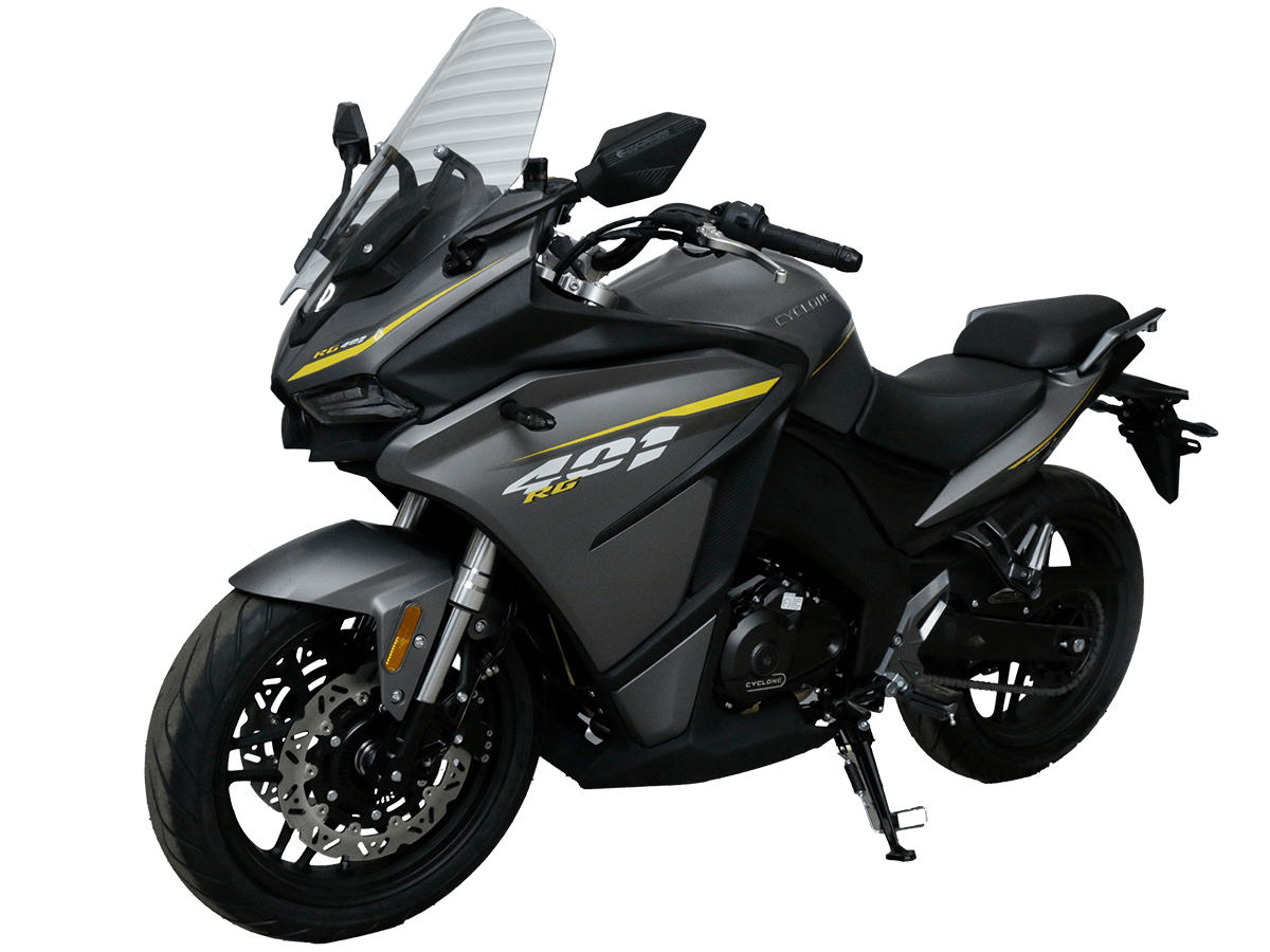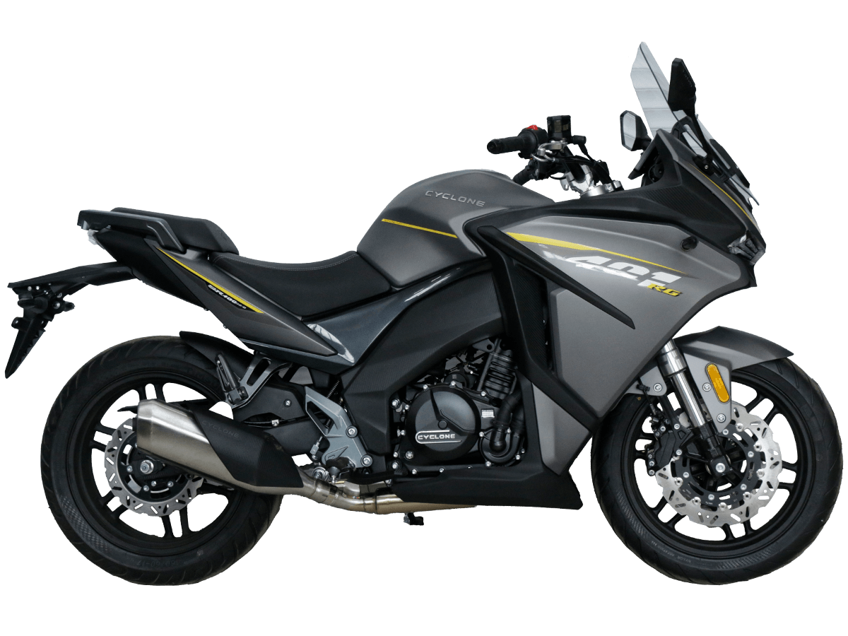 CYCLONE RG401 (SR400GS-B) – турист для покорения самых непростых и протяжённых маршрутов. Он обладает стремительным и современным дизайном в лучших “традициях жанра” туристических мотоциклов. Рядный двухцилиндровый четырёхтактный двигатель объёмом 401 см 3 выдаёт 43 л.с. на 9500 об/мин. Максимальный крутящий момент достигается на 8000 об/мин и составляет 37 Н·м. Инжекторный впрыск топлива с блоком управления BOSCH увеличивает топливную экономичность, а также позволяет добиться высокой приёмистости и неприхотливости агрегата. Жидкостная система охлаждения не допустит перегрева двигателя а даже на самых непростых маршрутах. На мотоцикл установлена 6-ступенчатая механическая коробка передач. Максимальная скорость мотоцикла составляет 155 км/ч. RG401 оснащён литыми алюминиевыми дисками диаметром 17 дюймов. Колёса обуты в бескамерные покрышки TIMSUN. С неровностями дороги эффективно справляются телескопическая вилка перевёрнутого типа спереди и маятник с моноамортизатором сзади. Ход передней подвески составляет 120 мм, задней – 55 мм. Оба компонента подвески являются регулируемыми. Эффективное и безопасное замедление с любых скоростей обеспечивают гидравлические дисковые тормоза с двухканальной системой ABS спереди и сзади. Клиренс мотоцикла составляет 155 мм. Объём топливного бака – 21 л. Снаряжённая масса – 213 кг. Модель имеет два видеорегистратора, механическую регулировку ветрового стекла, датчики давления в шинах, подсветку пультов и два USB-порта. При желании можно оснастить мотоцикл двумя боковыми кофрами. Мотоцикл сочетает в себе отличные технические характеристики, комфорт и надёжность, что позволяет вам ощутить настоящую свободу на любой дороге. Комплектация и внешний вид мотоцикла могут отличаться в зависимости от поставки. Изображение на сайте не гарантирует наличие тех или иных опций. Уточняйте информацию при оформлении заказа. Купить мотоцикл CYCLONE RG401 (SR400GS-B) по выгодной цене можно, оформив онлайн-заказ на нашем сайте.