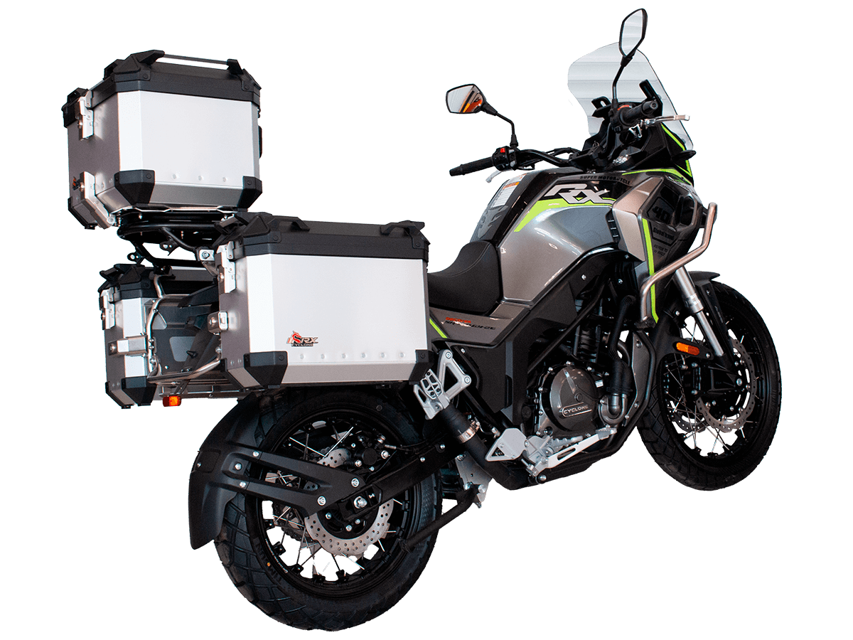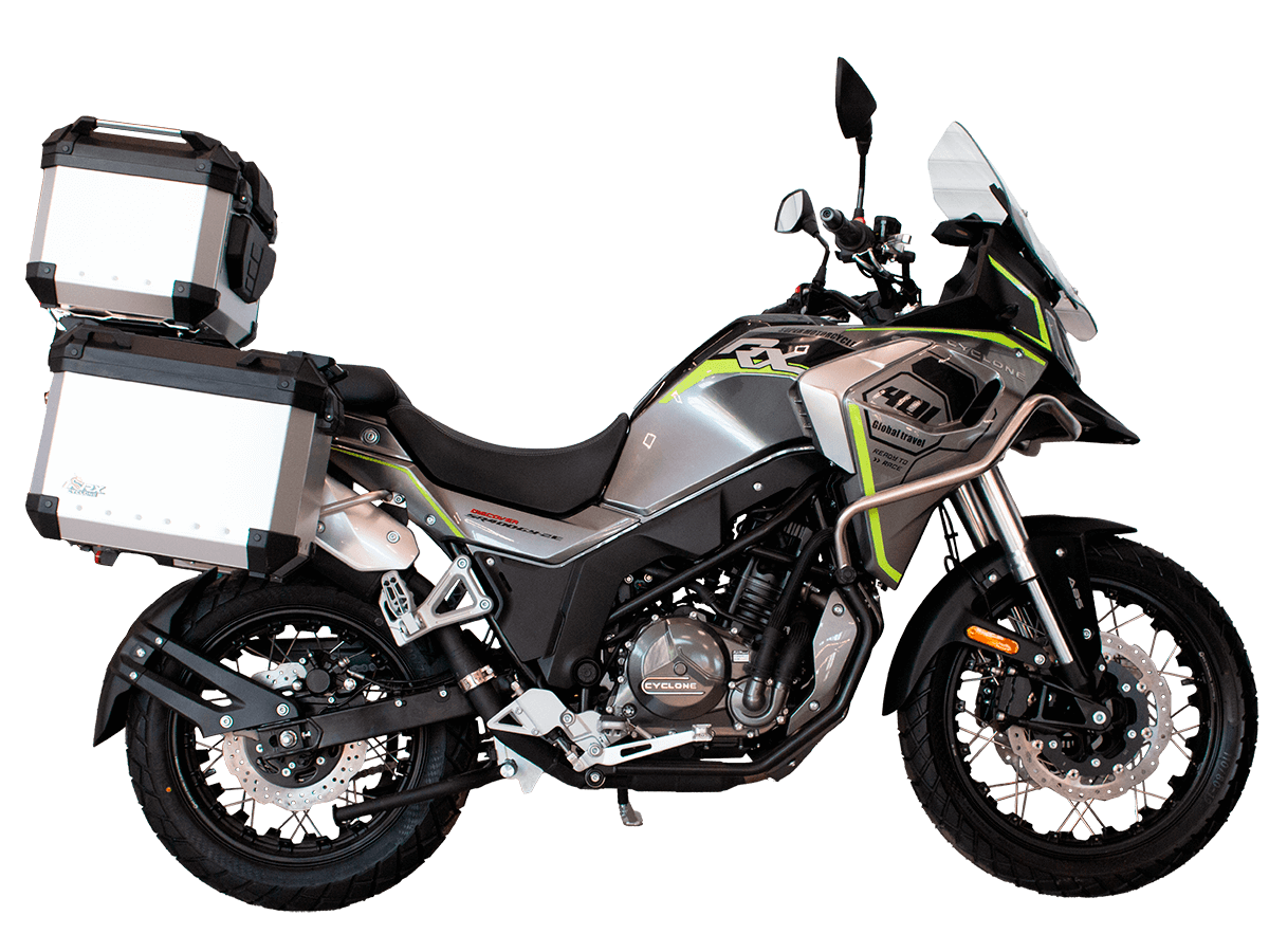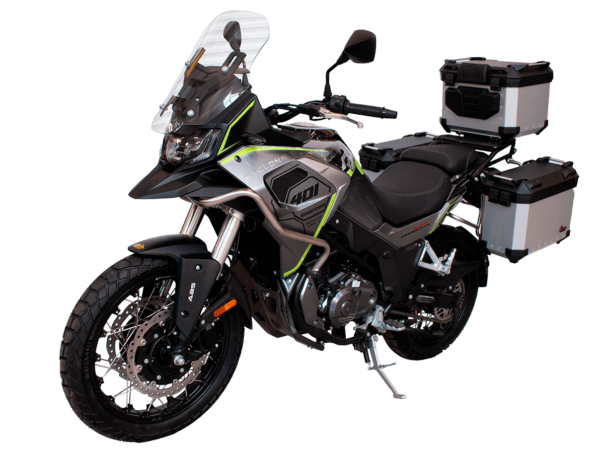 Мотоцикл CYCLONE RX401 (SR400GY-2D) – туристический эндуро, готовый бросить вызов любым дорогам и расстояниям. За рулём этого мотоцикла для вас не будет невозможных маршрутов. Его агрессивный дизайн всецело соответствует традициям жанра данного класса мототехники. Рядный двухцилиндровый четырёхтактный двигатель объёмом 401 см 3 выдаёт 43 л.с. на 9500 об/мин. Максимальный крутящий момент достигается на 8000 об/мин и составляет 37 Н·м. Инжекторный впрыск топлива с блоком управления BOSCH увеличивает топливную экономичность, а также позволяет добиться высокой приёмистости и неприхотливости агрегата. Жидкостная система охлаждения не допустит перегрева двигателя даже при самом агрессивном вождении. На мотоцикл 6-ступенчатая механическая коробка передач. Максимальная скорость мотоцикла составляет 139 км/ч. RX401 оснащён спицованными алюминиевыми колёсами диаметром 17 и 19 дюймов. Колёса обуты в бескамерные покрышки от фирмы CST. С неровностями дороги эффективно справляются телескопическая вилка перевёрнутого типа спереди и маятник с моноамортизатором сзади. Ход передней подвески составляет 130 мм, задней – 55 мм. Оба компонента подвески являются регулируемыми. Эффективное и безопасное замедление с любых скоростей обеспечивают гидравлические дисковые тормоза с двухканальной системой ABS спереди и сзади. Клиренс мотоцикла составляет 185 мм. Объём топливного бака – 20 л. Снаряжённая масса – 215 кг. Мотоцикл отличает хорошо продуманная компоновка с высоко расположенным радиатором. На данной модели штатно установлены дуги безопасности, защита картера и двигателя, а также багажник с креплениями для боковых кофров. Кроме того, мотоцикл снабжён центральной подножкой для лёгкого обслуживания цепи, колес и вилки. Бортовой компьютер оборудован цветным дисплеем привлекательного дизайна со специальным защитным козырьком, спасающим от брызг и бликов. Из других приятных мелочей в допоборудовании мотоцикла стоит выделить 12-вольтовую розетку, подсветку пультов и USB-порт. Мотоцикл сочетает в себе отличные технические характеристики, комфорт и надёжность, что позволяет вам ощутить настоящую свободу на любой дороге с любым покрытием. Комплектация и внешний вид мотоцикла могут отличаться в зависимости от поставки. Изображение на сайте не гарантирует наличие тех или иных опций. Уточняйте информацию при оформлении заказа. Купить мотоцикл CYCLONE RX401 (SR400GY-2D) по выгодной цене можно, оформив онлайн-заказ на нашем сайте.