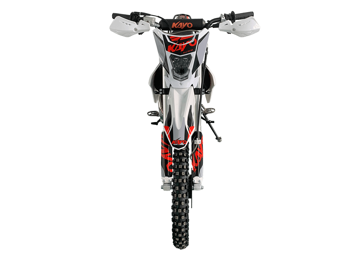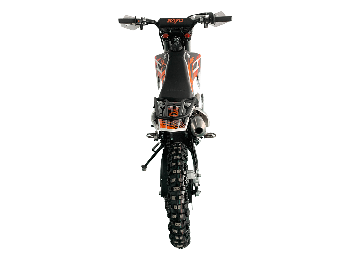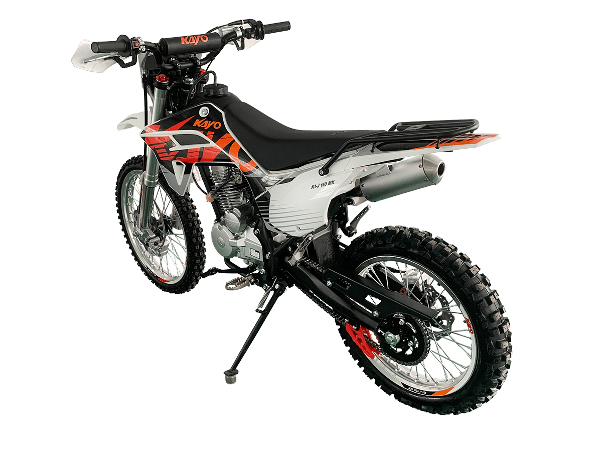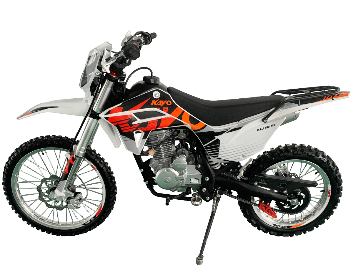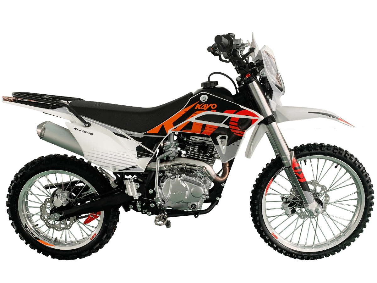 KAYO K1-J 150 MX (CB150) 19/16 (2025 г.) – мотоцикл для начала ваших внедорожных приключений. Мотоцикл оснащён 4-тактным двигателем SOHC и воздушным охлаждением. Кубатура 144,6 см³, диаметр и ход поршня – 65,5 x 49,5 мм, со степенью сжатия 9,2:1. Система подачи топлива представлена карбюратором PE24. Максимальная мощность 12 л.с. при 8500 об/мин и максимальный крутящий момент 10 Н·м при 6500 об/мин. Запуск двигателя осуществляется с помощью электростартера или кикстартера. Зажигание CDI. Ёмкость топливного бака 6 литров. Механическая 5-ступенчатая коробка передач с цепным приводом позволяет максимально эффективно передавать мощность на заднее колесо. Передняя нерегулируемая вилка 735 мм и задний нерегулируемый амортизатор 360 мм. Размерность колёс – 19 дюймов спереди и 16 дюймов сзади. Такие параметры обеспечивают отличную проходимость и устойчивость. Алюминиевые обода, ступицы и буксаторы. Гидравлические дисковые тормоза гарантируют безопасное торможение в любых ситуациях. Мотоцикл оборудован счётчиком моточасов, зеркалами заднего вида, задней багажной платформой, пассажирскими подножками и пластиковой защитой рычагов. Размеры 1850×760×1060 мм. Высота по седлу 790 мм. Дорожный просвет в 250 мм. Колёсная база 1250 мм. Сухая масса 95 кг. KAYO K1-J 150 MX (CB150) 19/16 (2025 г.) – идеальный выбор для тех, кто ищет надёжного двухколёсного друга. Он готов к приключениям и порадует как новичков, так и опытных райдеров. Купить мотоцикл KAYO K1-J 150 MX (CB150) 19/16 (2025 г.) по привлекательной цене можно онлайн на нашем сайте или в одном из салонов сети Роллинг Мото.