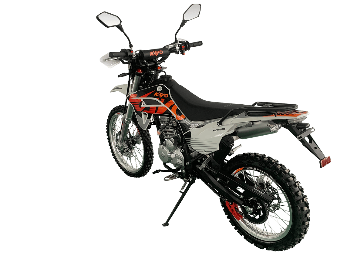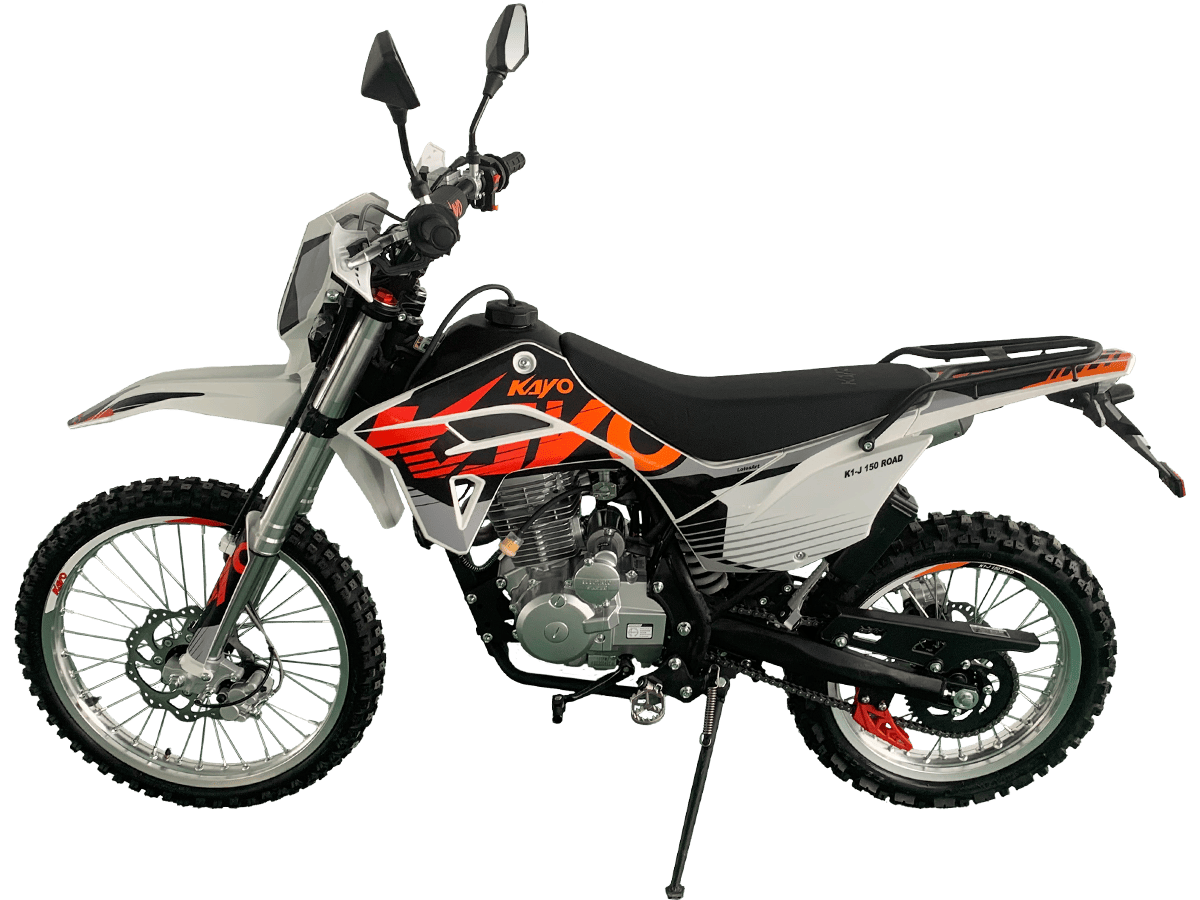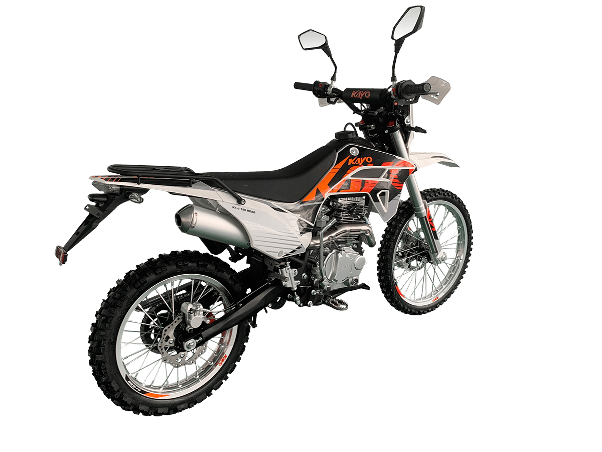 KAYO K1-J 150 ROAD (CB150) 19/16 (2025 г.) ПТС – мотоцикл, который создан для тех, кто готов покорять внедорожные трассы. 4-тактный мотор с воздушным охлаждением и одним верхним распределительным валом (SOHC) сочетает надёжность и отличную динамику. Объём двигателя составляет 144,6 см³. Он обеспечивает мощность в 12 л.с. при 8500 об/мин и максимальный крутящий момент 10 Н·м при 6500 об/мин. Степень сжатия 9,2:1, диаметр и ход поршня – 65,5 x 49,5 мм. Всё это работает в паре с карбюратором PE24, который гарантирует стабильную работу двигателя. Система запуска универсальная: электростартер и кикстартер, чтобы вы всегда были готовы к поездке. Тип зажигания CDI. Коробка передач механическая с 5 ступенями. Привод цепной. Топливный бак на 6 литров. Мотоцикл оснащён нерегулируемой передней 735 мм вилкой и задним 360 мм амортизатором. Задний маятник и прогрессия стальные. Траверсы выполнены из литого алюминия. Колёса размером 19 дюймов спереди и 16 дюймов сзади. Алюминиевые обода, ступицы и буксаторы. Для уверенной остановки предусмотрены гидравлические дисковые тормоза спереди и сзади. Габариты 1850×760×1060 мм и сухая масса всего 95 кг. Колёсная база 1250 мм. Дорожный просвет 250 мм, высота по седлу 790 мм. На KAYO K1-J 150 ROAD можно выезжать на дороги общего пользования благодаря наличию ПТС, цифровой приборной панели, звукового сигнала, зеркал заднего вида и необходимого набора светотехники. Имеются стальные подножки для поездок с пассажиром и задняя багажная платформа. Пластиковая защита рычагов. Купить мотоцикл KAYO K1-J 150 ROAD (CB150) 19/16 (2025 г.) ПТС по привлекательной цене можно онлайн на нашем сайте или в одном из салонов сети Роллинг Мото.
