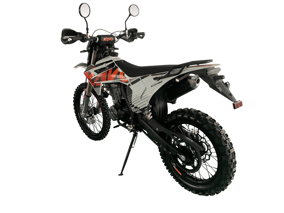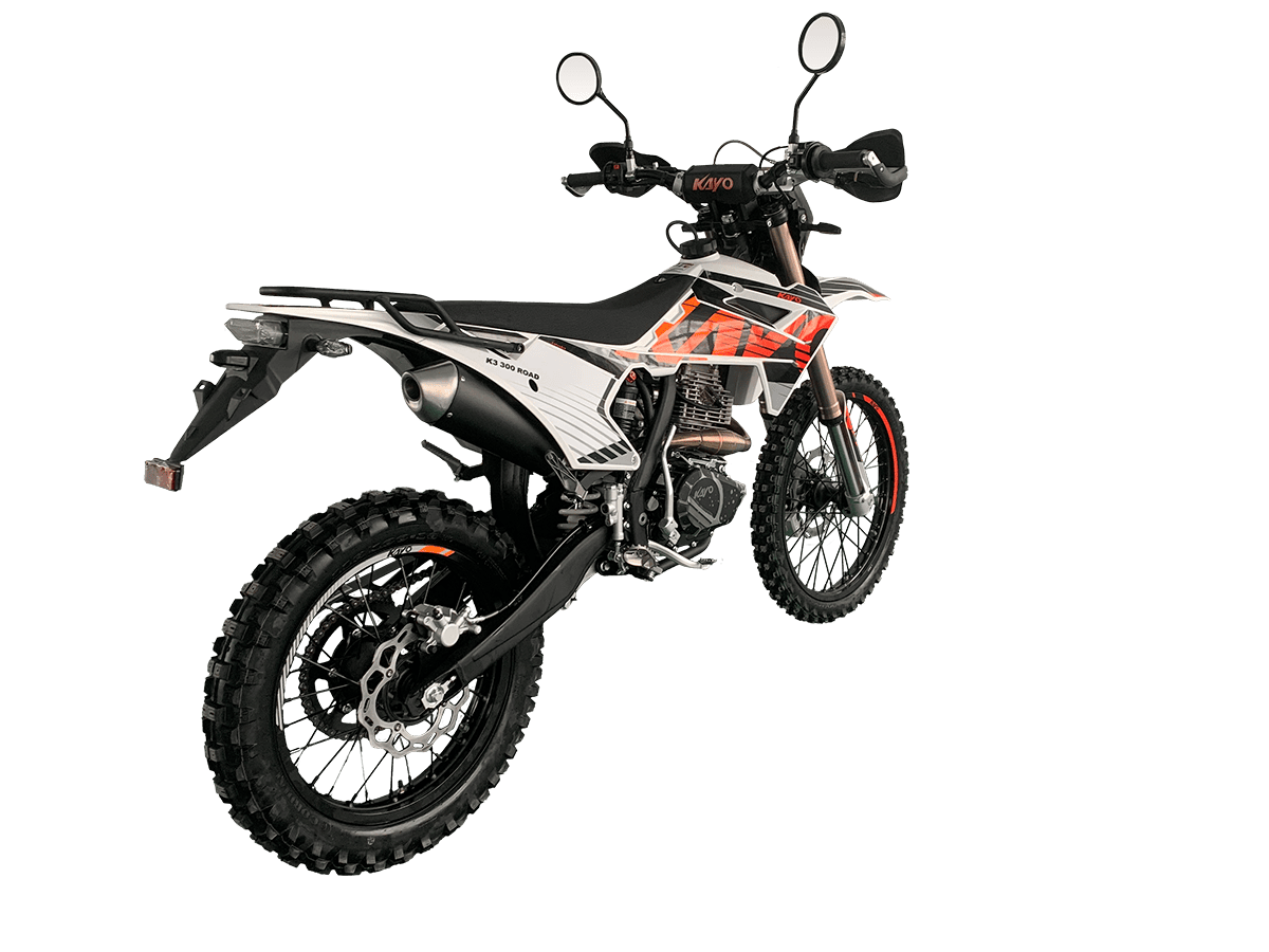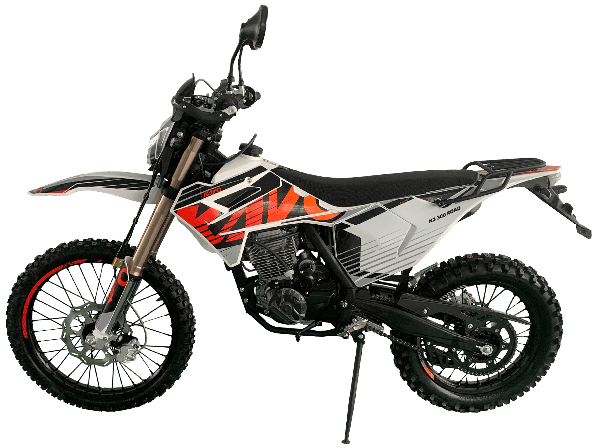 Мотоцикл KAYO K3 300 Road 21/18 2025 – модель нового прорывного эндуро, модернизированная для поездок по дорогам общего пользования. Модель Road имеет ПТС и всё необходимое снаряжение: приборная панель, указатели поворота, стоп-сигнал, звуковой сигнал, зеркала заднего вида. Для перевозки грузов установлена задняя багажная платформа, а для поездок с пассажиром имеется дополнительная пара подножек. Мотоцикл оснащён одноцилиндровым 4-тактным двигателем ZONGSHEN PR300/ZS175FMM-5 объёмом 271,3 см³ с балансирным валом и воздушным типом охлаждения. Максимальная мощность в 21,75 л.с. достигается при 8500 об/мин, а максимальный крутящий момент 22 Нм при 6500 об/мин. Соотношение диаметра и хода поршня 75,0х61,4. Степень сжатия 9,29:1. Карбюратор NIBBI PE30 обеспечивает топливную экономность и бесперебойную работу в самых сложных заездах. На мотоцикле установлена 5-ступенчатая коробка передач и цепной привод. Запуск двигателя осуществляется с помочью электростартера или кикстартера. Объём топливного бака 10 литров. Спицованные колёса с алюминиевыми ободами имеют диаметр 21 дюйм спереди и 18 сзади. Для подвески спереди используется телескопическая вилка перевёрнутого типа длиной 830 мм, а сзади установлен моноамортизатор длиной 450 мм. Оба компонента регулируются. На мотоцикле установлены гидравлические дисковые тормоза с 2-поршневой системой спереди и однопоршневой сзади. Мотоцикл готов к самым суровым вызовам бездорожья. Удобное расположение фильтр-бокса позволяет легко обслуживать его после заездов. Руль оснащён алюминиевой защитой рук с высокими пластиковыми накладками. На мотоцикле используются ручки-«неломайки» с регулировкой положения рычага и короткоходная ручка газа. Габариты 2100х810х1180 мм, вес 109 кг. Клиренс 340 мм, колёсная база 1390 мм, высота по седлу 900 мм. Купить мотоцикл KAYO K3 300 Road 21/18 2025 по привлекательной цене можно онлайн на нашем сайте или в одном из салонов сети Роллинг Мото.