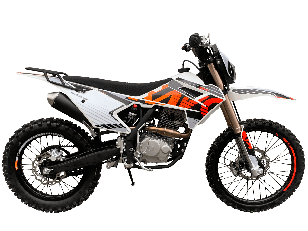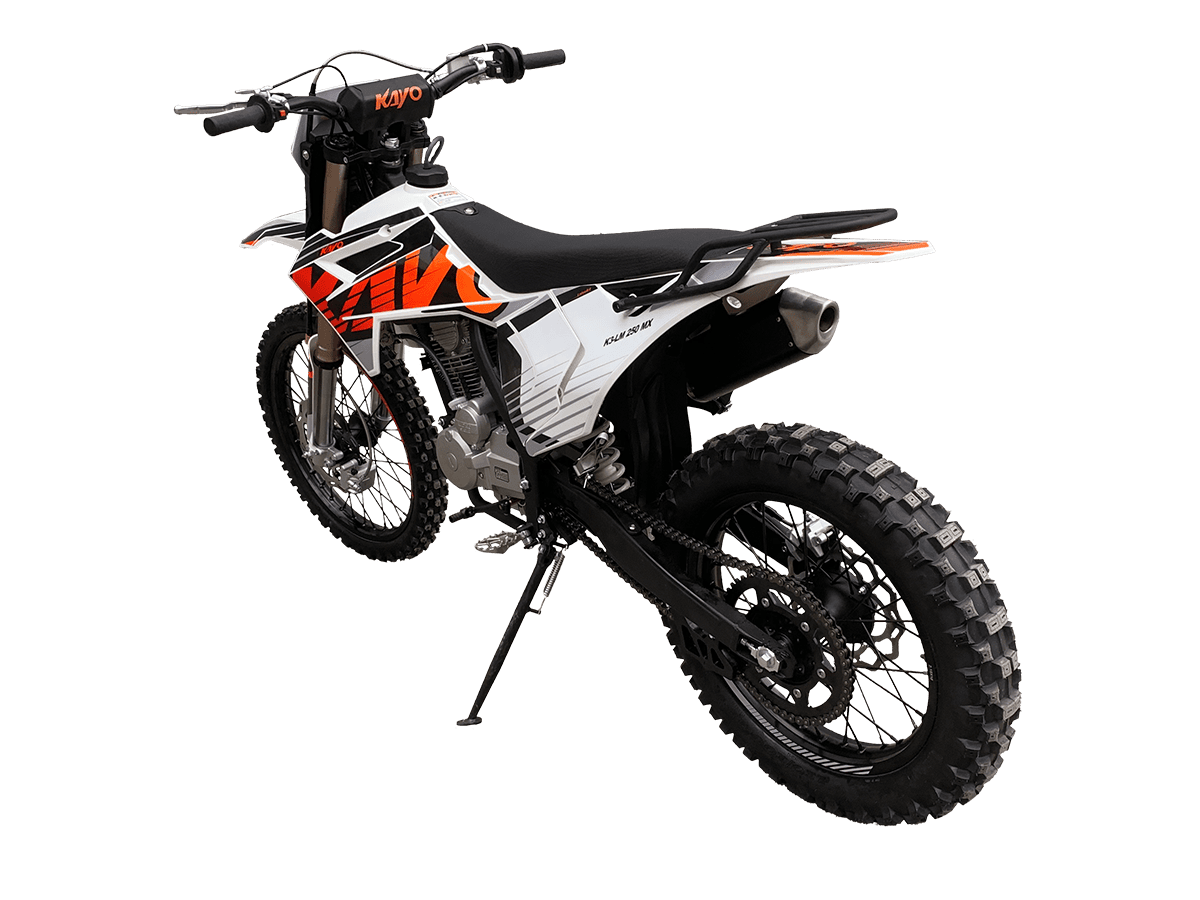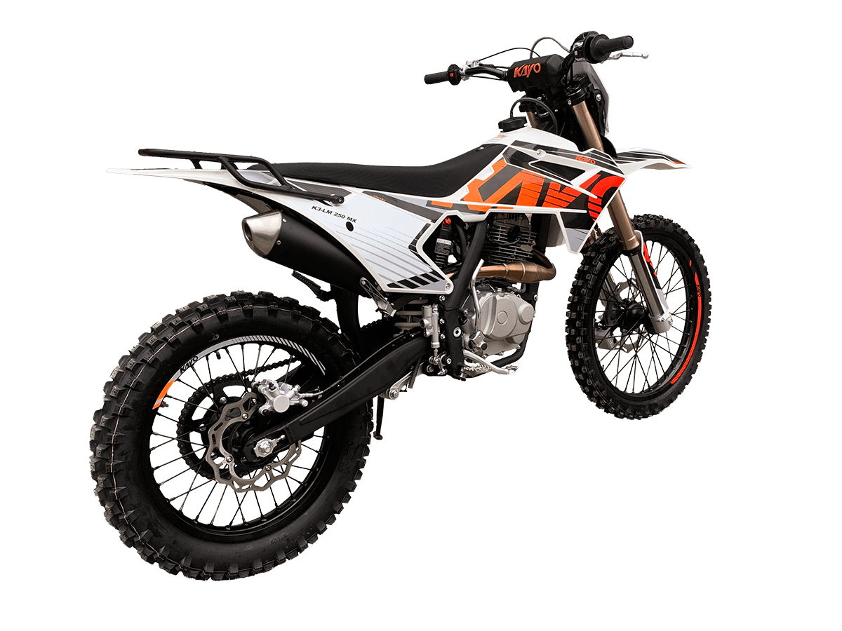 KAYO K3-LM 250 MX – выносливая и доступная база, созданная из проверенных временем компонентов. Подойдёт начинающим эндуристам для обучения и тренировочных прокатов. В основе – одноцилиндровый 4-тактный двигатель YX 166FMM CB250-C с 2 клапанами и воздушным охлаждением. Его рабочим объём составляет 223 см³. Запуск мотора осуществляется с помощью систем электро- или кикстартера. Стабильную работу на любых оборотах сохраняет карбюратор PE30. Коробка передач имеет 5 ступеней. Поглотить удары и вибрации рельефной поверхности готова нерегулируемая подвеска. Длина передней – 830 мм, длина заднего моноамортизатора с компенсационным бачком – 450 мм. Колёса диаметром 18 дюймов сзади и 21 дюйм спереди обуты в покрышки YUANGXING с глубоким протектором для лучшей проходимости и крепкого зацепа. Быструю остановку в критических ситуациях возьмут на себя двойные дисковые тормоза. Энергоэффективная передняя LED-фара даёт возможность преодолевать километры даже в вечернее время. Топливный бак на 10 л позволит проехать длительные расстояния без частых остановок. Встроенный счётчик моточасов поможет держать под контролем время обслуживания и продлить срок службы техники. KAYO K3-LM 250 MX – качественная техника без высоких затрат. Станет отличным стартом и продолжением вашей воли: будь то первые шаги или оттачивание мастерства на крутых склонах. Комплектация и внешний вид мотоцикла могут отличаться в зависимости от поставки. Изображение на сайте не гарантирует наличие тех или иных опций. Уточняйте информацию при оформлении заказа. Купить мотоцикл KAYO K3-LM 250 MX по выгодной цене можно, оформив онлайн-заявку на нашем сайте или посетив лично один из мотосалонов сети Роллинг Мото.