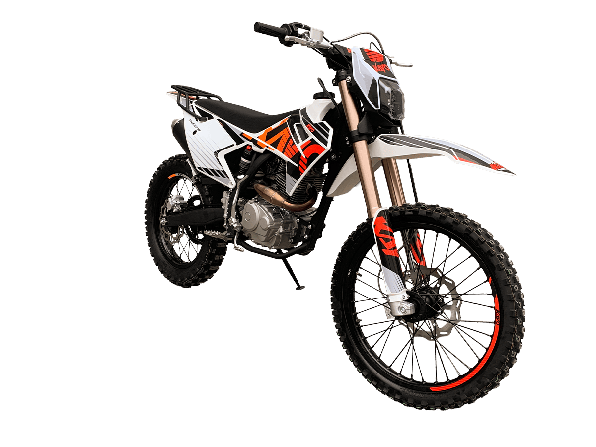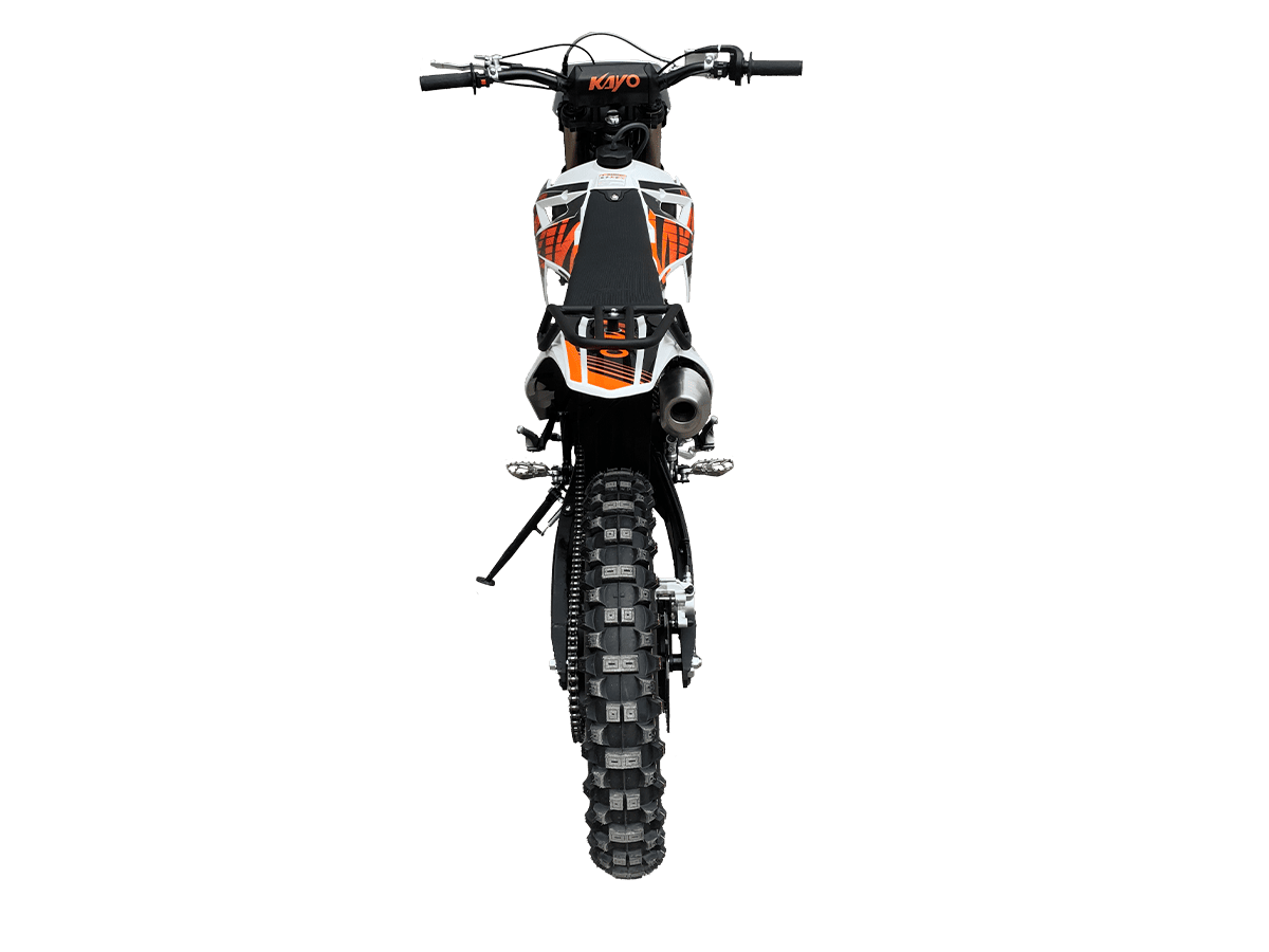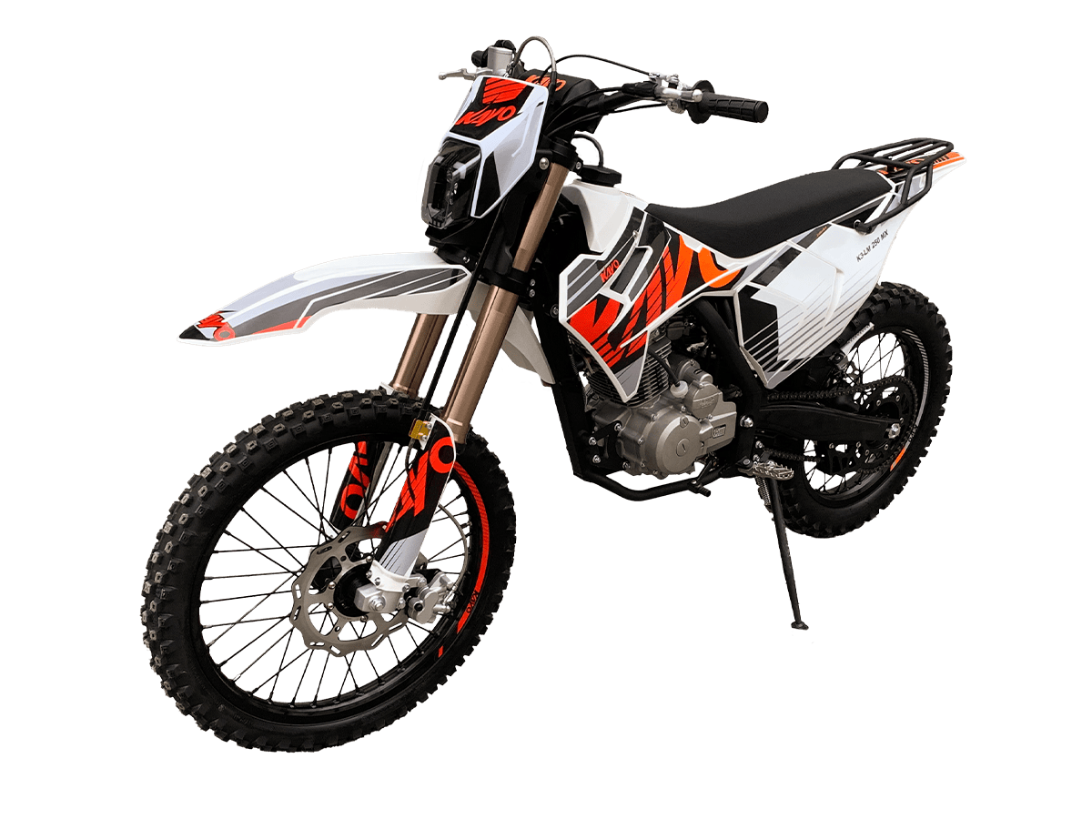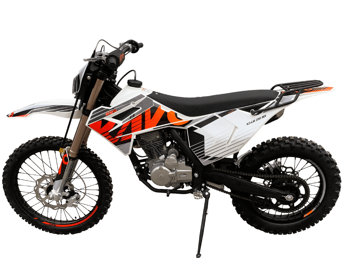 KAYO K3-LM 250 MX – выносливая и доступная база, созданная из проверенных временем компонентов. Подойдёт начинающим эндуристам для обучения и тренировочных прокатов. В основе – одноцилиндровый 4-тактный двигатель YX 166FMM CB250-C с 2 клапанами и воздушным охлаждением. Его рабочим объём составляет 223 см³. Запуск мотора осуществляется с помощью систем электро- или кикстартера. Стабильную работу на любых оборотах сохраняет карбюратор PE30. Коробка передач имеет 5 ступеней. Поглотить удары и вибрации рельефной поверхности готова нерегулируемая подвеска. Длина передней – 830 мм, длина заднего моноамортизатора с компенсационным бачком – 450 мм. Колёса диаметром 18 дюймов сзади и 21 дюйм спереди обуты в покрышки YUANGXING с глубоким протектором для лучшей проходимости и крепкого зацепа. Быструю остановку в критических ситуациях возьмут на себя двойные дисковые тормоза. Энергоэффективная передняя LED-фара даёт возможность преодолевать километры даже в вечернее время. Топливный бак на 10 л позволит проехать длительные расстояния без частых остановок. Встроенный счётчик моточасов поможет держать под контролем время обслуживания и продлить срок службы техники. KAYO K3-LM 250 MX – качественная техника без высоких затрат. Станет отличным стартом и продолжением вашей воли: будь то первые шаги или оттачивание мастерства на крутых склонах. Комплектация и внешний вид мотоцикла могут отличаться в зависимости от поставки. Изображение на сайте не гарантирует наличие тех или иных опций. Уточняйте информацию при оформлении заказа. Купить мотоцикл KAYO K3-LM 250 MX по выгодной цене можно, оформив онлайн-заявку на нашем сайте или посетив лично один из мотосалонов сети Роллинг Мото.