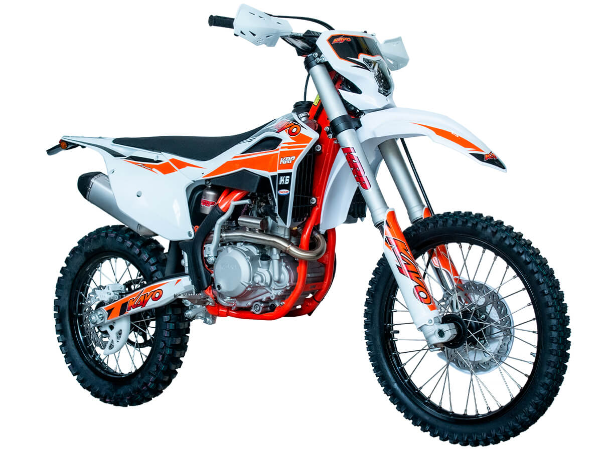 Мотоцикл KAYO K6 300 (182MN) FCR 2024 модельного года – идеальный снаряд для внедорожного экстрима, представляющий собой оптимальный баланс производительности и технической оснащённости. Модель обладает высокими характеристиками, которые позволяют ей справляться с непростыми условиями маршрутов как на кроссовых трассах, так и в хард эндуро. Одноцилиндровый 4-тактный двигатель жидкостного охлаждения ZONGSHEN ZS182MN с 4 клапанами и балансирным валом имеет объём 283 см3, обеспечивает высокую мощность (32 л.с.) и крутящий момент, что позволяет развивать большую скорость и с лёгкостью преодолевать трассы со сложным рельефом. Карбюратор FCR 36 обеспечивает бесперебойную работу техники в самых жёстких условиях эксплуатации, простоту и лёгкость в обслуживании, а также неприхотливость к качеству топлива. Мотоцикл оснащён 6-ступенчатой механической коробкой передач с классической схемой 1-N-2-3-4-5-6. Рама разработана фирмой KAYO и выполнена из хроммолибденового сплава. Передняя подвеска — телескопическая вилка перевёрнутого типа KRP длиной 950 мм, задняя — моноамортизатор KRP длиной 480 мм. Оба компонента подвески регулируются на сжатие и отбой, а задняя подвеска также регулируется по преднатягу. В паре они позволяют эффективно амортизировать удары при езде по неровностям и препятствиям на трассе. Мотоцикл оснащён классическими спицованными колёсами диаметром 18 и 21 дюйм. Эффективное и безопасное замедление с любых скоростей обеспечивают гидравлические дисковые тормоза – спереди установлен 2-поршневой суппорт и тормозной диск CNC диаметром 270 мм, а сзади – однопоршневой суппорт с диском диаметром 240 мм. Диск переднего тормоза снабжён специальным защитным кожухом. Рычаг переднего тормоза – 360 PROCAKEN. Мотоцикл достаточно компактен и имеет вес всего 114 кг. Топливный бак вмещает 7,5 литров горючего. Высококачественная износостойкая резина с развитым протектором отлично держит дорогу на различных типах покрытия и в самых разных поворотах. Сиденье эргономичной формы покрыто антискользящим материалом. Данная модель укомплектована яркой галогенной фарой, которая позволяет кататься в тёмное время суток. KAYO K6 300 (182MN) FCR сочетает в себе отличные технические характеристики, комфорт и надёжность, что позволяет вам ощутить настоящую свободу на любой трассе. Купить мотоцикл KAYO K6 300 (182MN) FCR 21/18 по выгодной цене вы можете, оформив онлайн-заявку на нашем сайте или посетив лично один из мотосалонов сети Роллинг Мото.