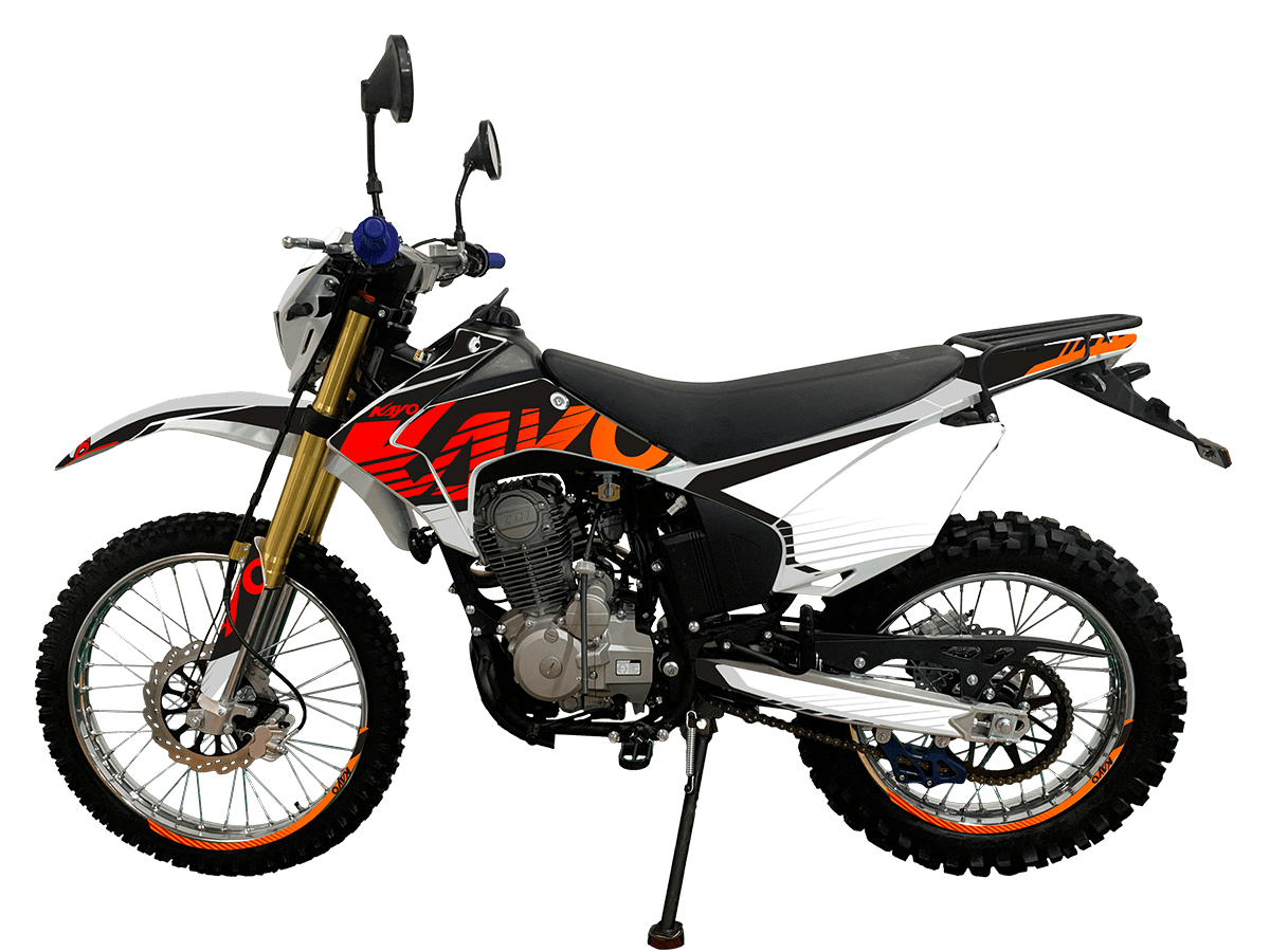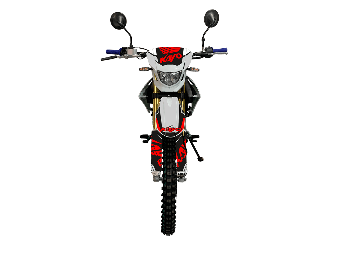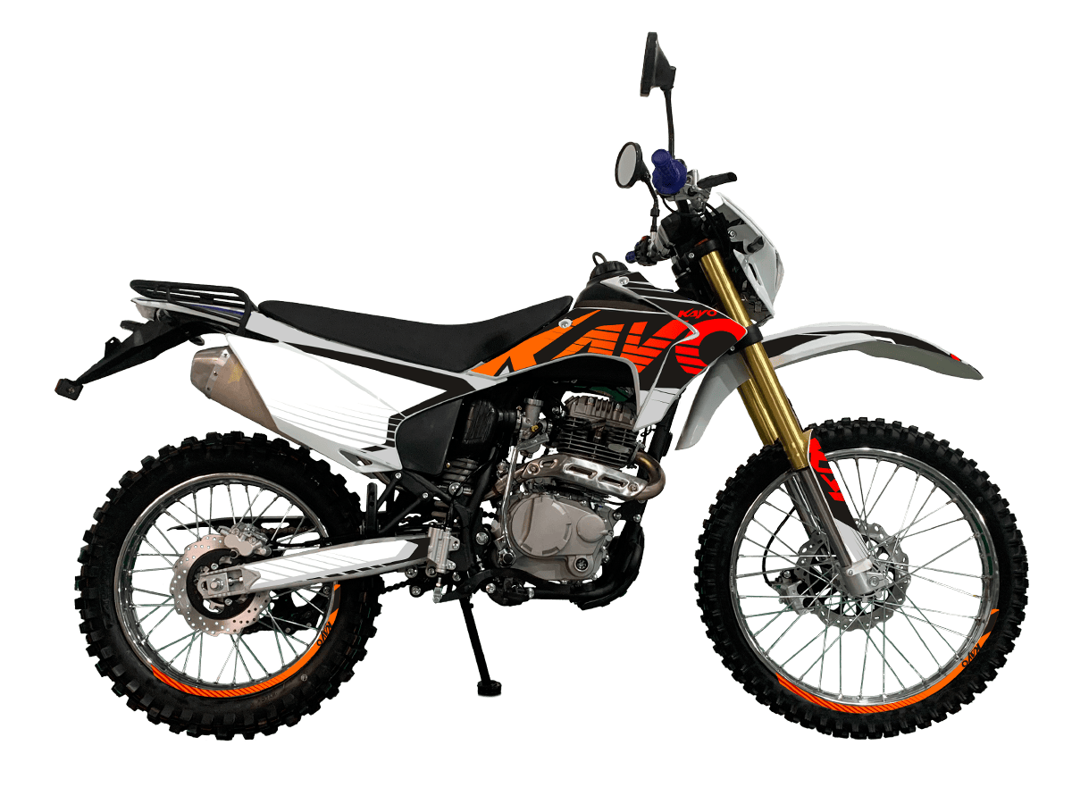 Мотоцикл KAYO T1-L 250 Enduro 21/18 2025 ПТС – облегчённая модель надёжного и производительного эндуро, уже готовая к покорению внедорожных трасс. Оснащён 4-тактным двигателем объёмом 223 см³ с верхним распредвалом и воздушным типом охлаждения. Способен развивать мощность в 16,32 л.с. при 8500 об/мин, а максимальный крутящий момент 17,5 Нм достигается при 6500 об/мин. За подачу топлива отвечает карбюратор PE30. Он обеспечивает топливную экономность и бесперебойную работу двигателя даже в самых жёстких условиях. Соотношение диаметра цилиндра и хода поршня 65,5x62,2. Степень сжатия 9,6:1. Запуск двигателя осуществляется с помощью электростартера или кикстартера. Тип зажигания CDI. Снизу установлена пластиковая защита двигателя. Механическая коробка передач имеет 5 ступеней. Привод цепной. Объём топливного бака 9 литров. На мотоцикл установлены спицованные колёса с алюминиевыми ободами и ступицами. Обуты во внедорожные покрышки YUANXING 80/100-21 и 110/100-18. Длина подвески спереди 830 мм, длина задней подвески 370 мм. Задняя подвеска оснащена прогрессией. Траверсы выполнены из литого алюминия, а прогрессия – из стали. За торможение отвечают дисковые гидравлические тормоза. Прочная рама и маятник выполнены из стали. Мотоцикл имеет ПТС и оснащён всем необходимым для поездок по дорогам общего пользования: галогеновая фара, диодные поворотники, диодный стоп-сигнал, звуковой сигнал, цифровая приборная панель, зеркала заднего вида. Для управления установлен руль переменного сечения 28 мм Fatbar со стандартными рычагами сцепления и тормоза. Имеется платформа для перевозки грузов и дополнительные подножки для поездок с пассажиром. Габариты мотоцикла 2100х810х1180 мм, вес 119 кг. Клиренс 300 мм, колёсная база 1400 мм, высота по седлу 890 мм. Купить мотоцикл KAYO T1-L 250 Enduro 21/18 2025 ПТС по привлекательной цене можно онлайн на нашем сайте или в одном из салонов сети Роллинг Мото.