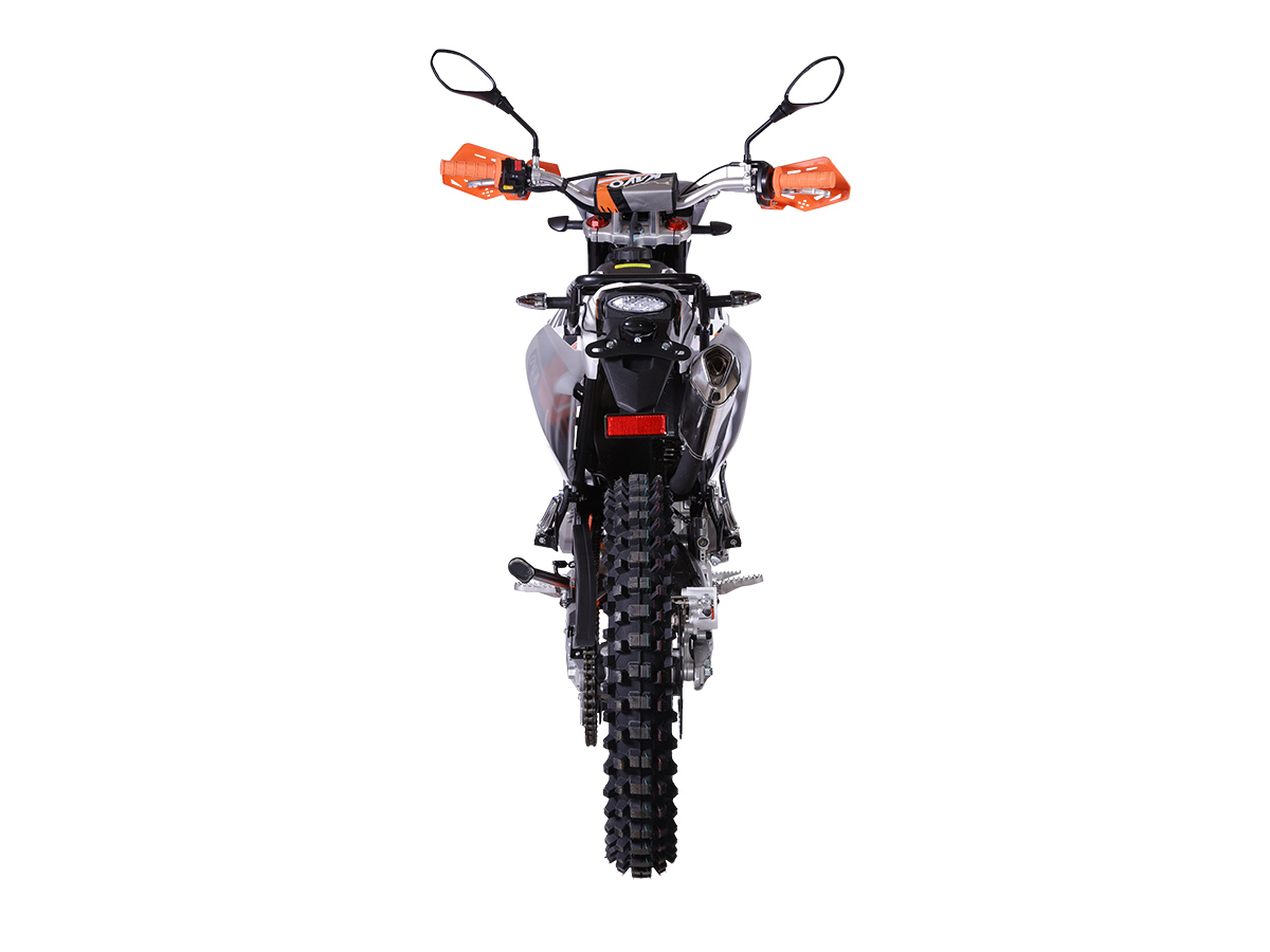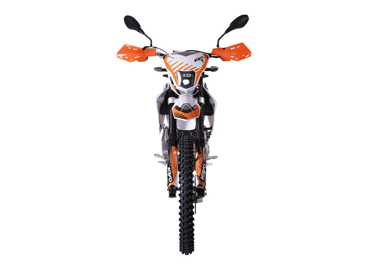 Мотоцикл KAYO T2 300 Enduro PR – идеальный снаряд для внедорожного экстрима, представляющий собой оптимальный баланс производительности и технической оснащённости, поэтому он идеально подходит как новичкам, так и опытным райдерам. Удобный, простой и надёжный мотоцикл, который полностью оправдывает свою цену. Мотоцикл оснащён одноцилиндровым 4-тактным двигателем воздушного охлаждения (ZONGSHEN PR ZS175FMM-5) объёмом 271 см 3 , который обеспечивает высокую мощность (24 л.с.) и крутящий момент, что позволяет развивать большую скорость и с лёгкостью преодолевать трассы со сложным рельефом. Двигатель имеет балансирный вал, который эффективно гасит вибрации. Карбюратор NIBBI PE30 обеспечивает бесперебойную работу техники в самых жёстких условиях эксплуатации, простоту и лёгкость в обслуживании, а также неприхотливость к качеству топлива. Двигатель работает в паре с 5-ступенчатой механической коробкой передач с классической схемой “1-N-2-3-4-5”. Аппарат оснащён системой запуска двигателя при помощи кнопки электростартера или при помощи рычага кик-стартера. Усиленная рама из хром-молибденового сплава и подвеска позволяют эффективно амортизировать удары при езде по неровностям и препятствиям на трассе. Передняя подвеска — регулируемая телескопическая вилка перевёрнутого типа от фирмы KKE длиной 800 мм, задняя — регулируемый моноамортизатор 420 мм, также произведённый компанией KKE. Мотоцикл оснащён классическими спицованными колёсами диаметром 18 и 21 дюйм. Колёса имеют усиленные обода из алюминиевого сплава и буксаторы. Эффективное и безопасное замедление с любых скоростей обеспечивают гидравлические дисковые тормоза. Мотоцикл достаточно компактен и имеет вес всего в 115 кг, поэтому он комфортен в эксплуатации одновременно и для мужчин среднего телосложения, и для девушек. Высококачественная износостойкая резина с развитым протектором отлично держит дорогу на различных типах покрытия и в самых разных поворотах. Благодаря удобным подножкам и сиденью эргономичной формы, покрытому антискользящим материалом, на мотоцикле комфортно ездить вдвоём. Мотоцикл имеет ПТС и весь необходимый комплект светотехники, позволяющий ездить по дорогам общего пользования. T2 300 Enduro PR сочетает в себе отличные технические характеристики, комфорт и надёжность, что позволяет вам ощутить настоящую свободу на любой трассе. Купить мотоцикл KAYO T2 300 Enduro PR по выгодной цене вы можете, оформив онлайн-заявку на нашем сайте или посетив лично один из мотосалонов сети Роллинг Мото.